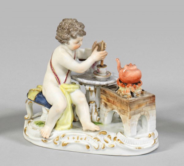 Amorette als Allegorie des Feuers aus der Serie "Vier Elemente". Auf rocaillereliefiertem Sockel, vor einem Herd mit Kanne über loderndem Feuer sitzende Amorette bei der Zubereitung von Trinkschokolade. Polychrome Malerei mit Goldstaffage. Entw. Johann Joachim Kaendler. Minim. best.; Schwertermarke. H. 10,5 cm.