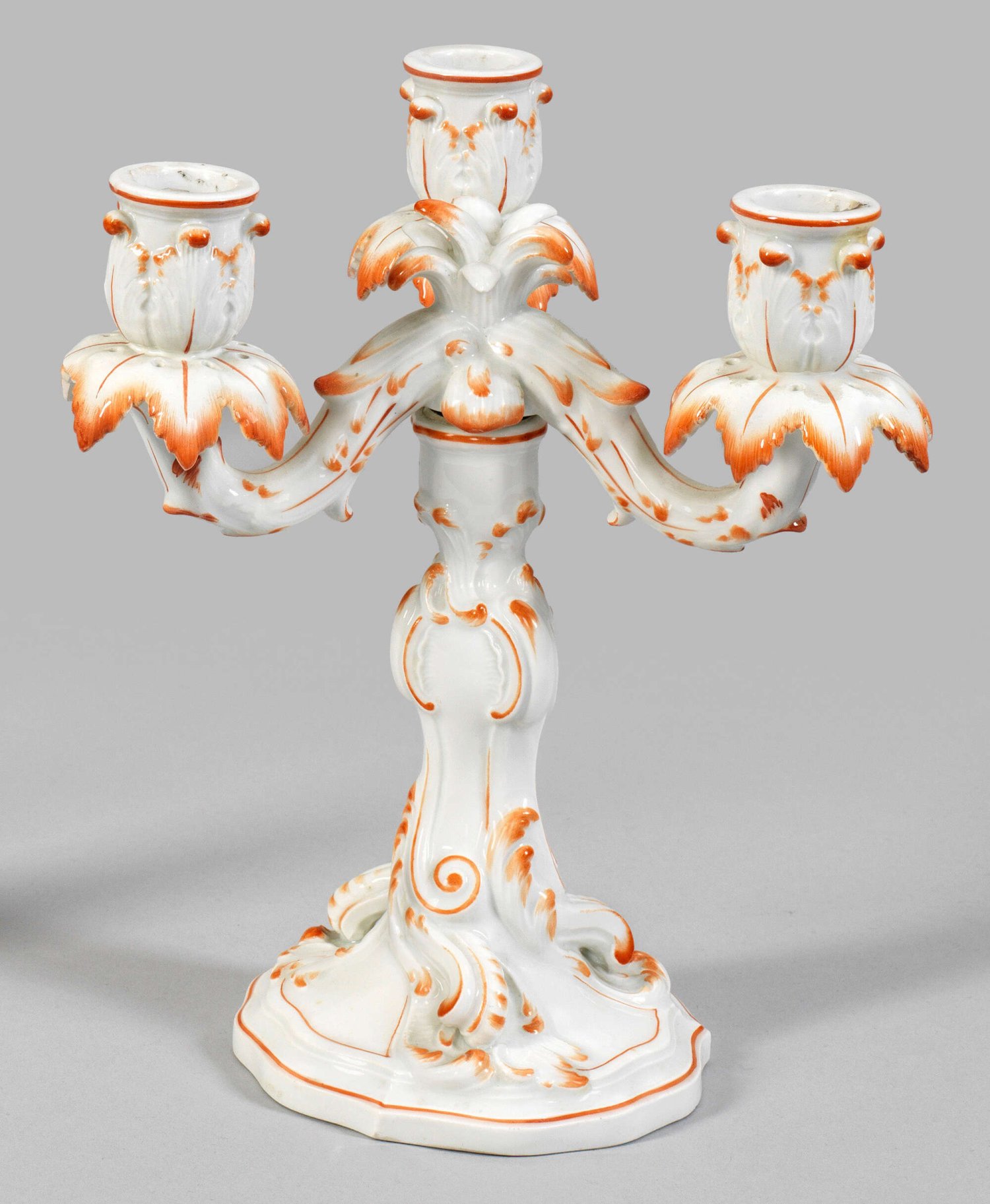 Dreiflammiger Leuchter 1-bzw. 3-flg.; Von passig geschweiftem Rundfuß aufsteigender, dreiseitig gedrehter Balusterschaft mit Tülle, darin einsetzbare dreiflammige Leuchterkrone aus gebogten Leuchterarmen mit blütenkelchartigen Tüllen über gezacktem Blattkranz. Rest.; Minim. besch.; Schwertermarke. H. 23 cm.
