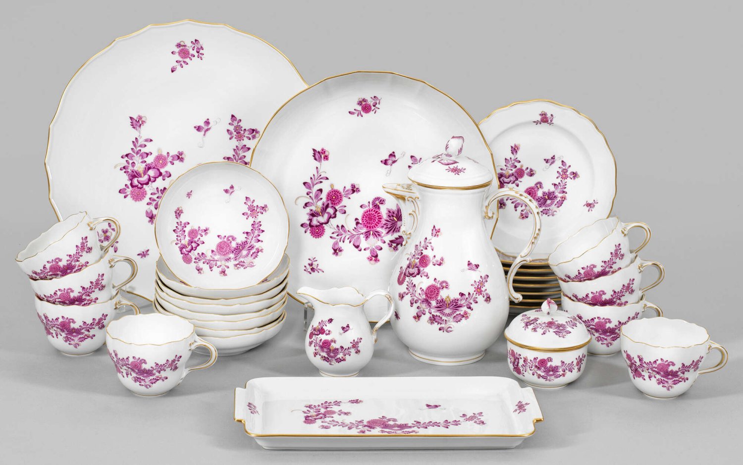 Kaffeeservice mit Indianischem Dekor für 8 Personen. 22-tlg.; Kaffeekanne, Zuckerdose, Sahnegießer, 8 Tassen mit Untertassen, 8 Kuchenteller, Königskuchen-, Tortenplatte, Gebäckschale. Feiner Indianischer Blumendekor in purpurfarbener, Gold gehöhter Camaieumalerei. Goldstaffage. Schwertermarke. Kannen-H. 24 cm. Platten-D. 31 cm.