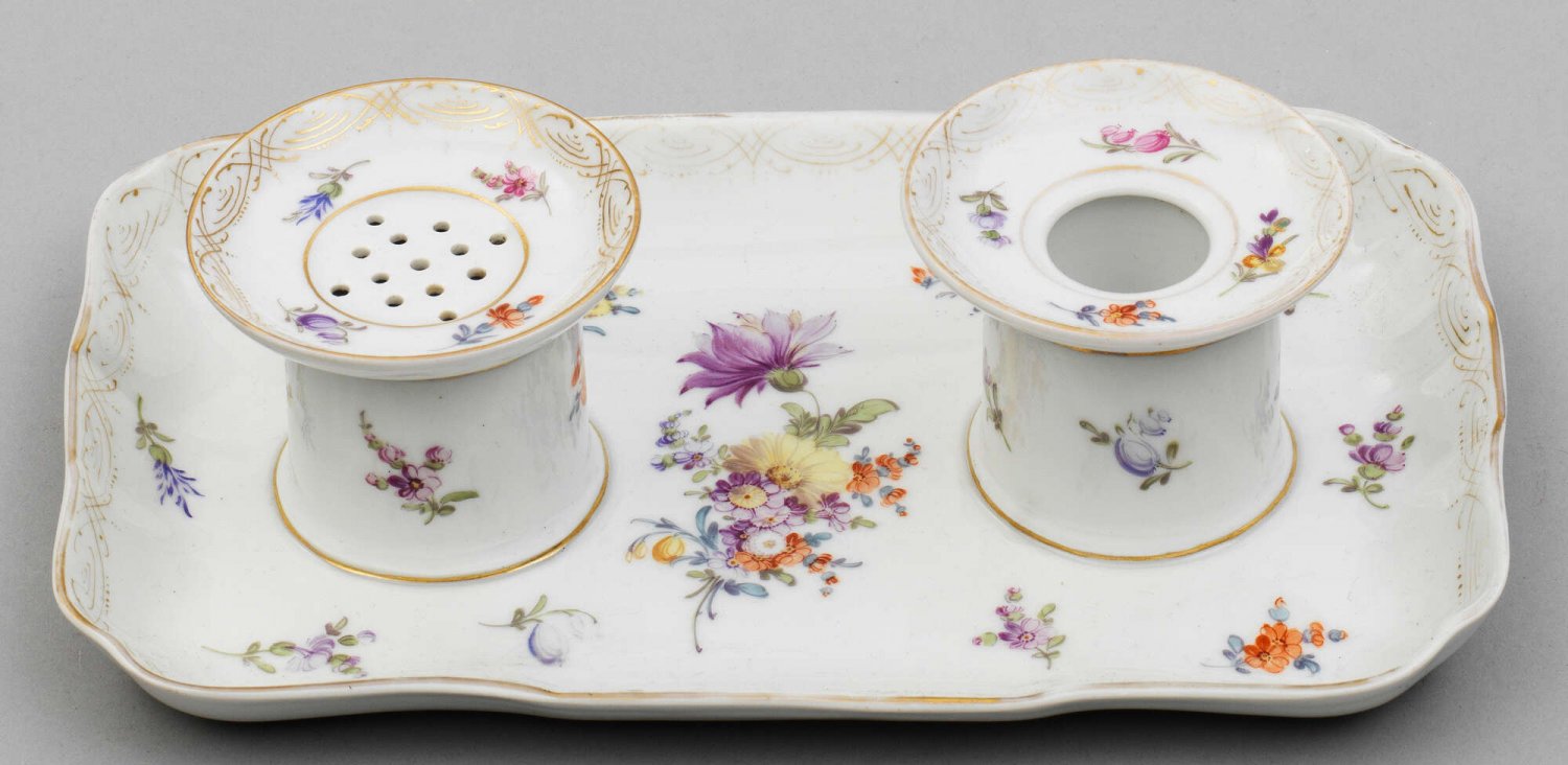 Schreibgarnitur Auf rechteckigem, geschweiftem Tablett zwei konische Halterungen, darin als Einsatz ein Sandstreuer und Tintenfass. Polychrome Blumenmalerei mit Golddekor. Gold ber.; Manufakturmarke. H. 7 cm. 24,5 cm x 15,5 cm.