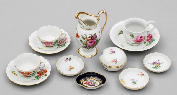 Konvolut von Meissener Porzellan 9-tlg.; 3 Mokkatassen mit Untertassen, Sahnegießer, Deckeldöschen, 4 Ablageschälchen. Verschiedene, farbenfrohe Blumendekore in polychromer Malerei, teilw. mit Goldstaffage. Teilw. kobaltblauer Fond. Kannen-H. 14,5 cm. D. 8 cm - 14,5 cm.