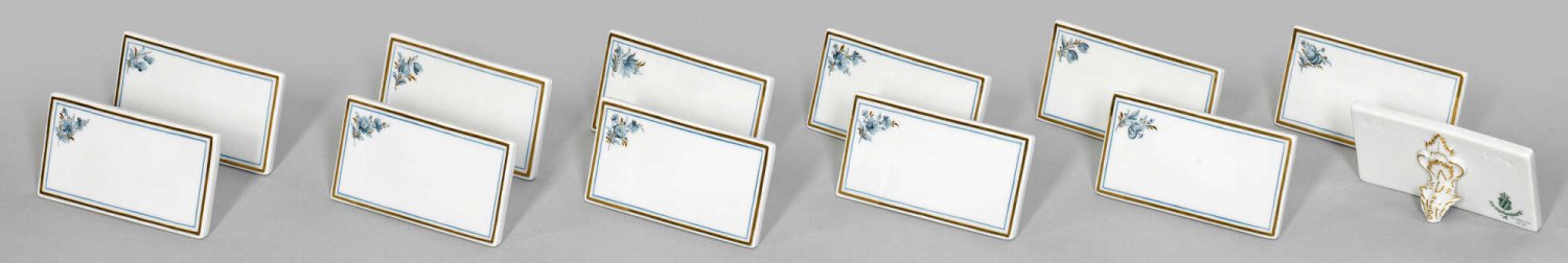 Zwölf Tischkarten Rechteckige Form, rückseitige Aufsteller in Rocailleform. Goldene und blaue Einfassungslinie, oben links mit verschiedenen Blumenbuketts dekoriert. Blaumalerei, goldstaffiert. Grüne Manufakturmarke, Prägezeichen. 4,4 cm x 8,4 cm.