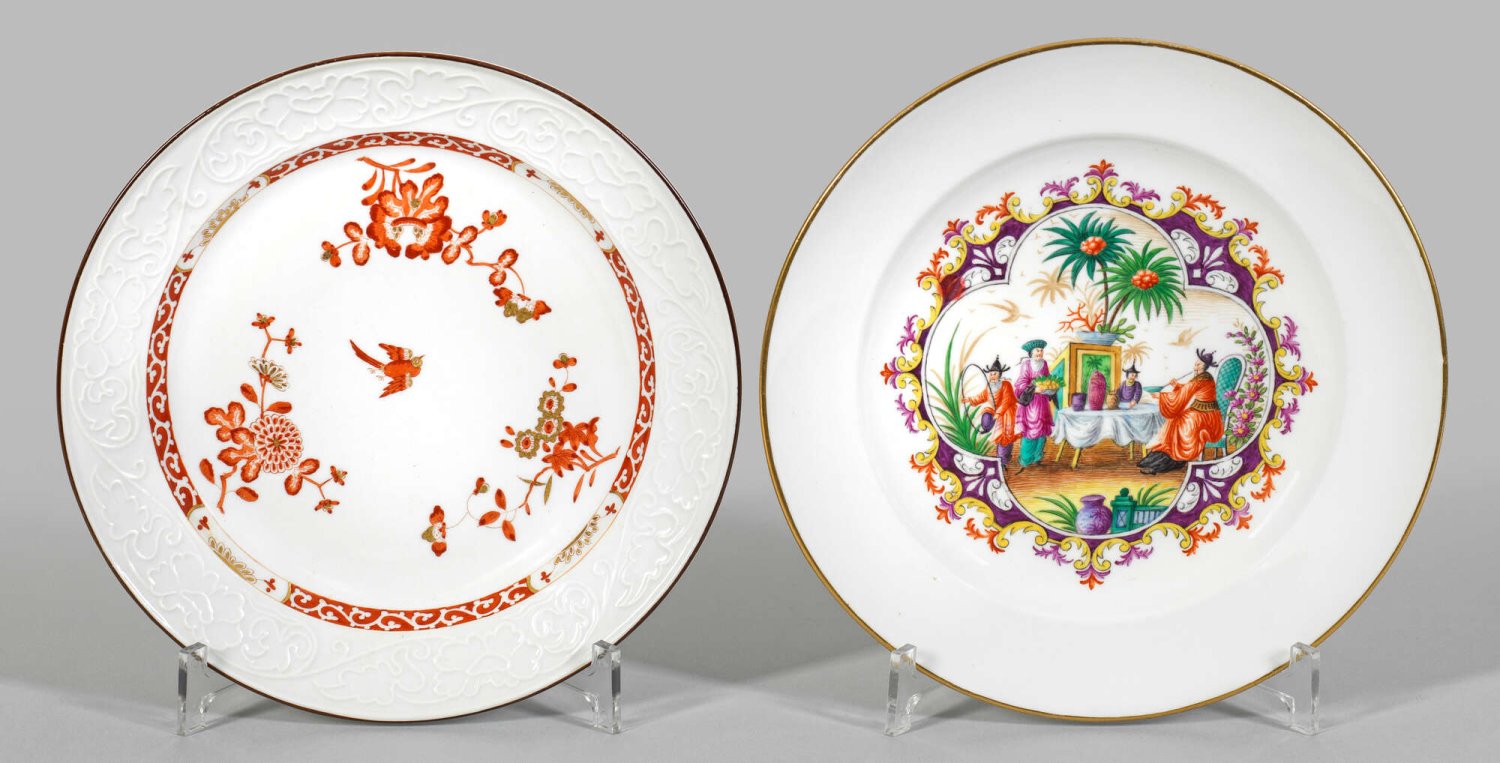 Zwei Zierteller Runde Form. Teilw. floral stilisierter Reliefdekor auf der Fahne. Im vertieften Spiegel Indianischer Blumendekor mit Vogel bzw. Chinoiserie-Szene in vierpassiger, von Laub-und Bandelwerk gerahmter Reserve. Polychrome und eisenrote, teilw. Gold gehöhte Camaieumalerei. Brauner sowie Goldrand. Schwertermarke. D. 23,5 cm - 24 cm.