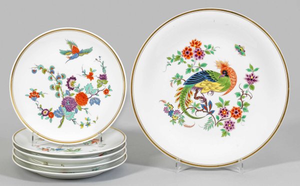 Sechs Zierteller mit Kakiemondekor Runde, flach gemuldete Form. Farbenprächtiger, stilisierter Dekor nach ostasiatischem Vorbild mit großen, blühenden Chrysanthemen-, Päonien- und Prunuszweigen, Vögeln, Kranichen und Drachen, u.a. sog. "Chinesischer Drache und Storch" sowie "Indisches Fasanenmuster". Polychrome, teilw. Gold gehöhte Malerei. Goldrand. Schwertermarke. D. 25,5 cm - 36 cm.