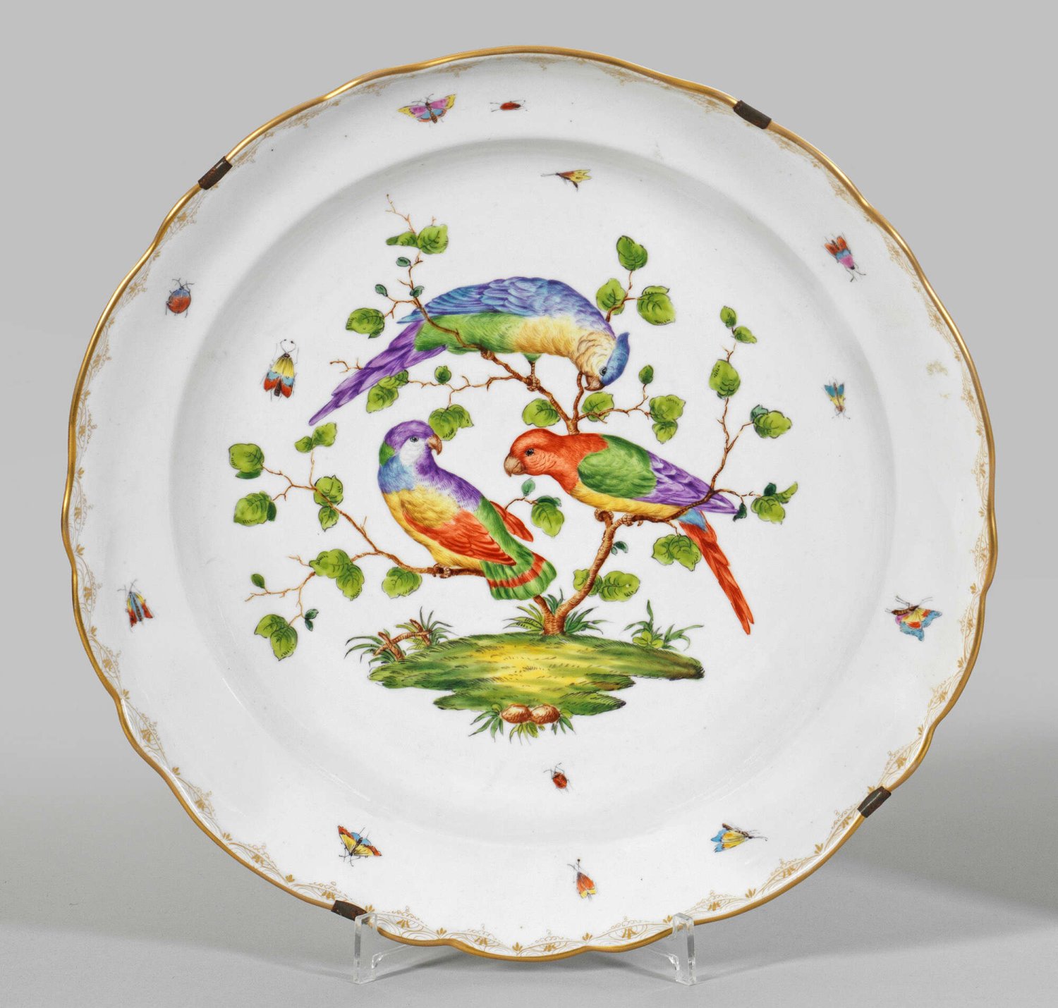 Große Schauplatte mit Papageiendekor Runde Form. Im vertieften Spiegel farbenprächtiger Dekor aus drei, auf Ästen sitzenden Papageien umgeben von Schmetterlingen und Insekten in polychromer Malerei. Golddekorrand. Manufakturmarke. D. 41 cm.