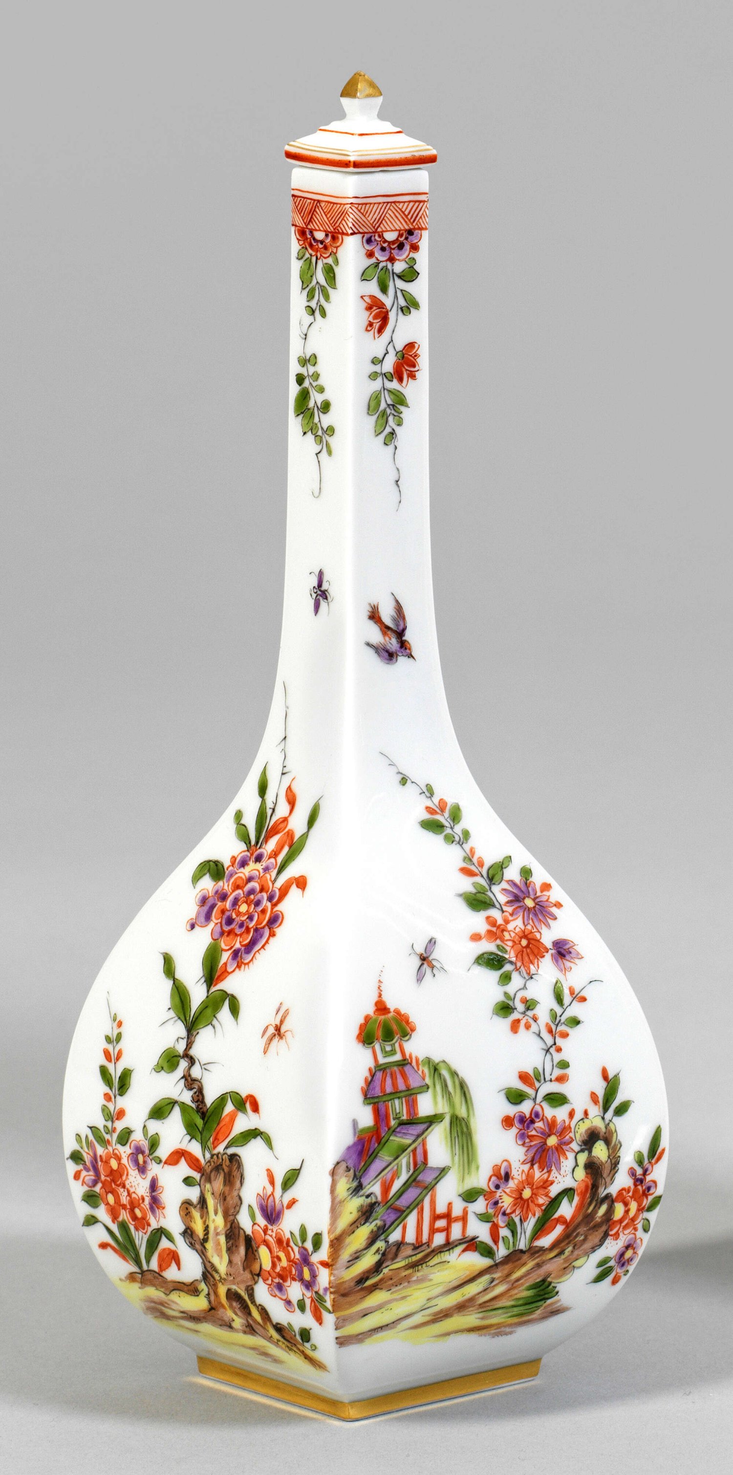 Sakeflasche mit Kakiemondekor Über einem quadratischen Stand vierkantiger, in schmalen Hals übergehender Korpus. Auf der Wandung Chinoiserie-Dekor einer blühenden Gartenlandschaft mit Pagoden. Polychrome Malerei. H. 23,5 cm.
