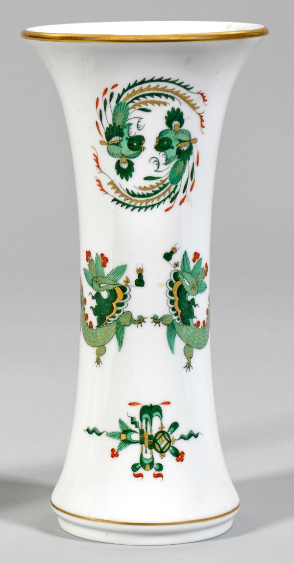 Trompetenvase mit Dekor "Reicher Drache" in grüner, rot- und goldschattierter Malerei. Goldrand. Schwertermarke. H. 25 cm.