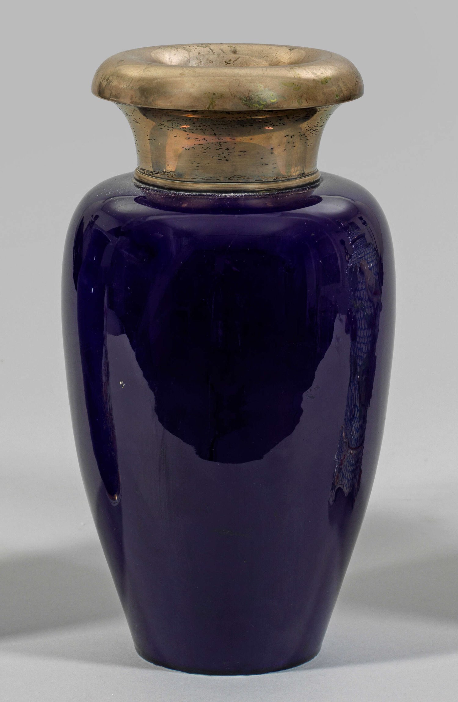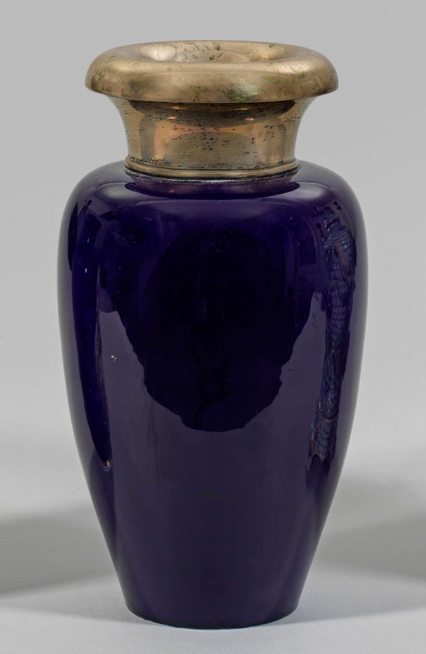 A porcelain cobalt-blue ground baluster vase with silver-mount from the estate of a German opera singer. Supplemented plated mount. Crossed swords mark.