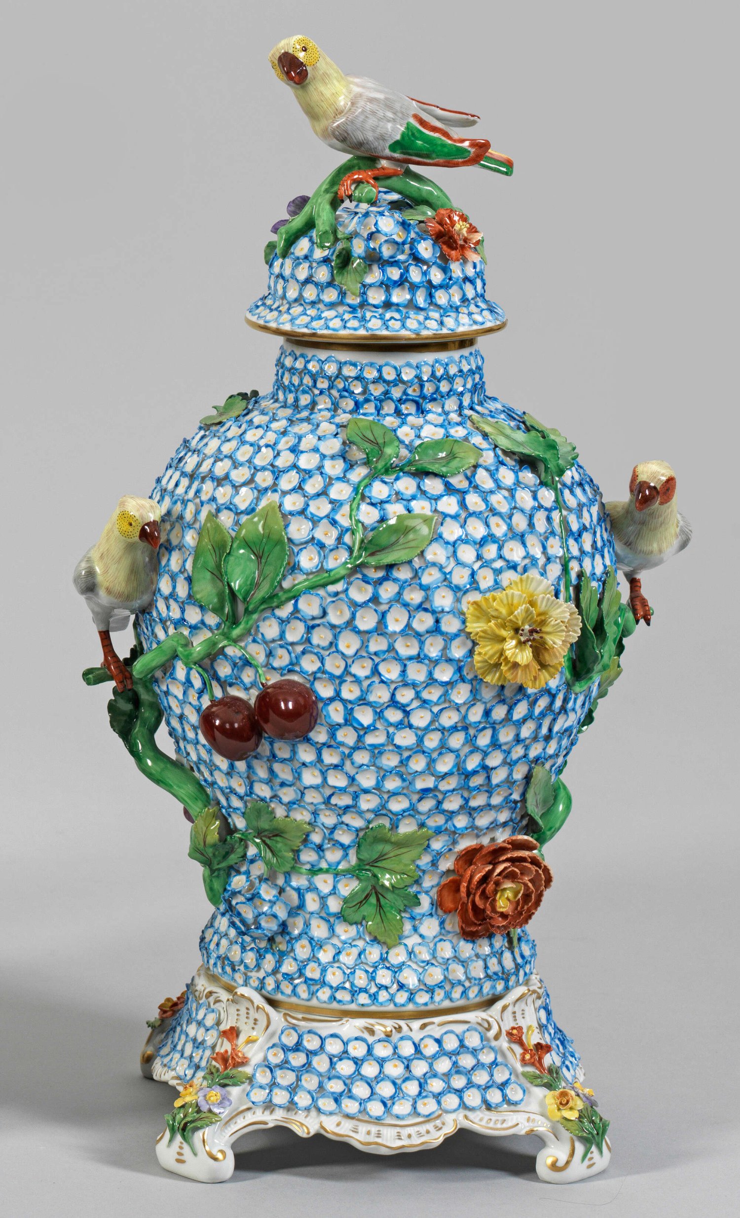 Prächtige Deckelvase mit Vergissmeinnicht-Dekor auf Sockel. Balusterförmiger Korpus mit aufgewölbtem Deckel. Flächendeckender Fond aus kleinen, aufgelegten Vergissmeinnichtblüten mit stark plastischen Ästen, fein modellierten Blüten, Früchten und Vögeln. Polychrome Malerei mit Goldrand. Minim. best.; Manufakturmarke. H. 39 cm.