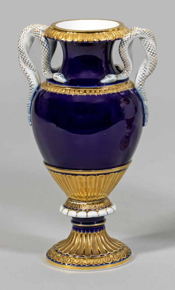 Kleine Schlangenhenkelvase Balusterförmiger Korpus, umzogen von verschiedenen, reliefierten Ornamentbordüren. Seitlich aufsteigende, sich spiralförmig windende Schlangenhenkel. Kobaltblauer Fond mit reicher Goldstaffage. Entw. Ernst August Leuteritz. Schwertermarke. H. 27,5 cm.