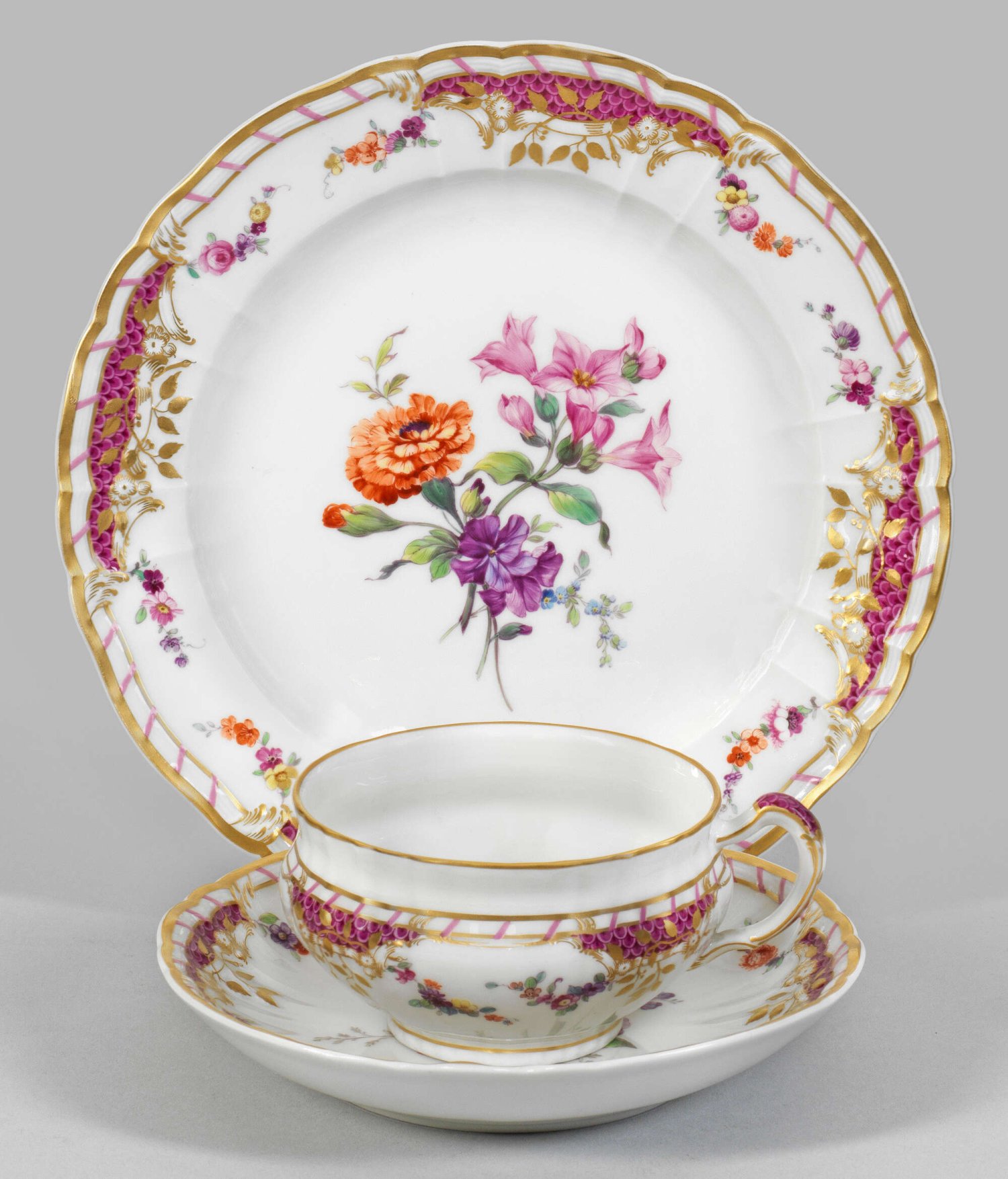 Teegedeck Gedrückte, bauchige Tassenform. Feiner reliefplastischer Dekor "Rocaille". Am Rand purpurnes Schuppenmuster und umlaufende, von einer Blütengirlande umwundene Goldbordüre. Im Spiegel Blumenbukett. Polychrome Malerei mit Goldstaffage. Jahresbuchstabe, Zepter- und Malereimarke. D. 19,5 cm.