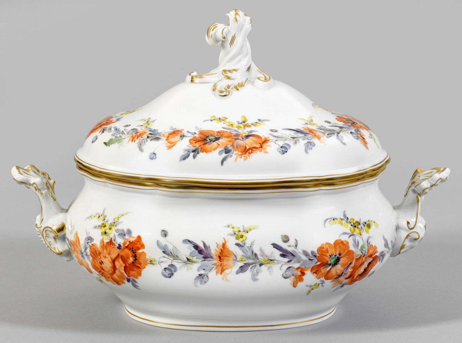 Deckelterrine mit Mohnkranzdekor von Bärbel Patzig Ovaler, gedrückt bauchiger Korpus mit seitlichen Blatthenkeln und aufgewölbtem Deckel, mittig plastischer Blattknauf. Umlaufende Bordüre aus Mohnblumen in feiner polychromer Malerei von Bärbel Patzig. Goldstaffage. Im Boden Maler-Sign. in Gold. Schwertermarke. H. 25 cm. 36 cm x 23 cm.