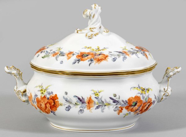 A porcelain tureen with poppies decor painted by B. Patzig. Painter's signature. Crossed swords mark.