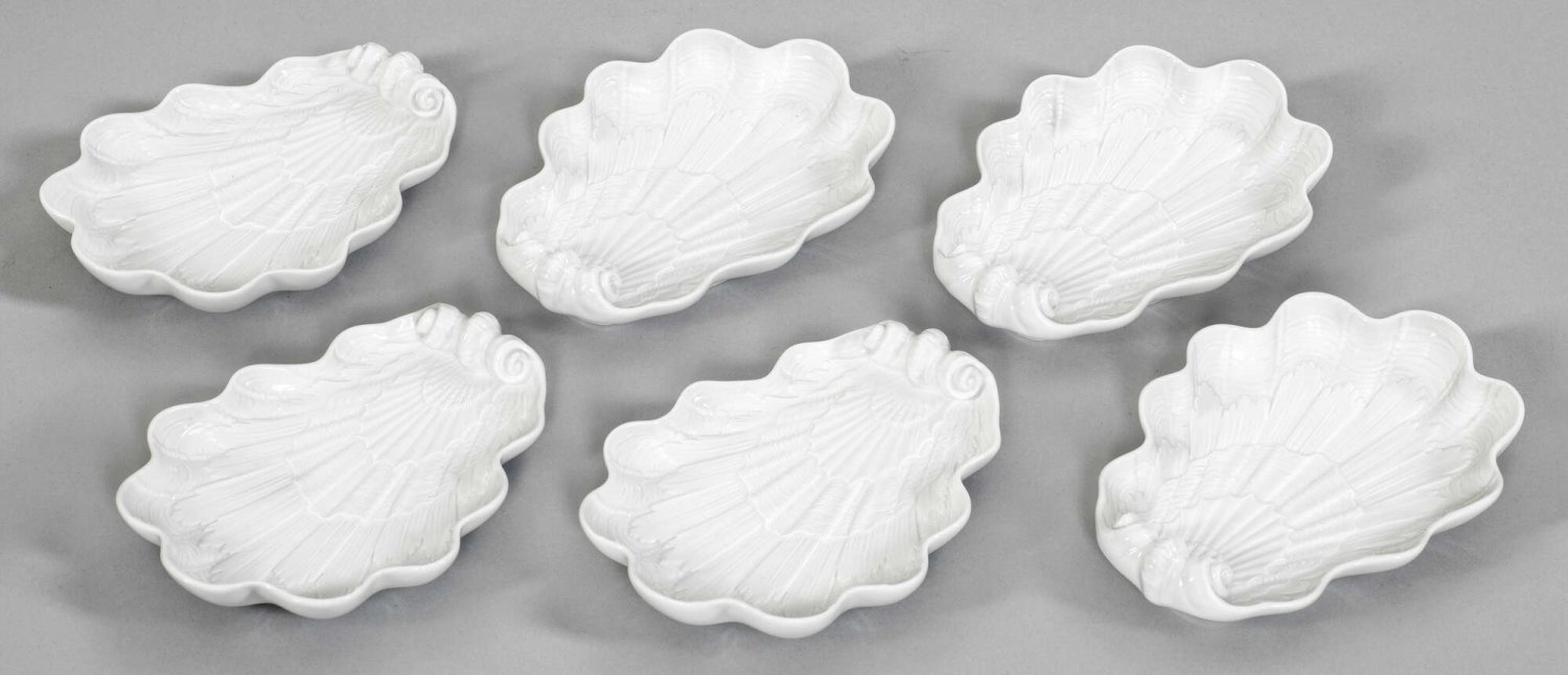 Six shell-shaped porcelain bowls for oysters. Partly inscribed "Club meeting 2012". Date sign. Crossed swords mark.