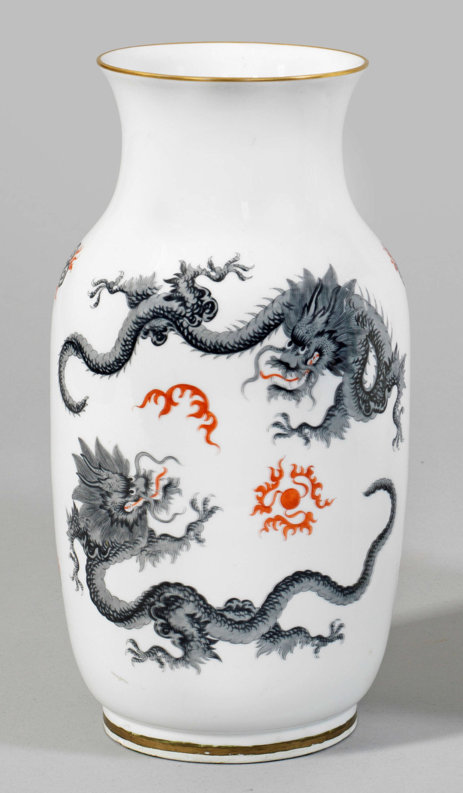 Große Ziervase mit Dekor "Mingdrache" Balusterförmig mit ausschwingendem Rand. Beidseitig der Wandung zwei chinesische Drachen mit geflammter Perle zwischen stilisierten Wolken- und Flammensymbolen. Polychrome Malerei in Grau und Schwarz sowie Rot. Goldrand. Rest.; Schwertermarke. H. 35 cm.