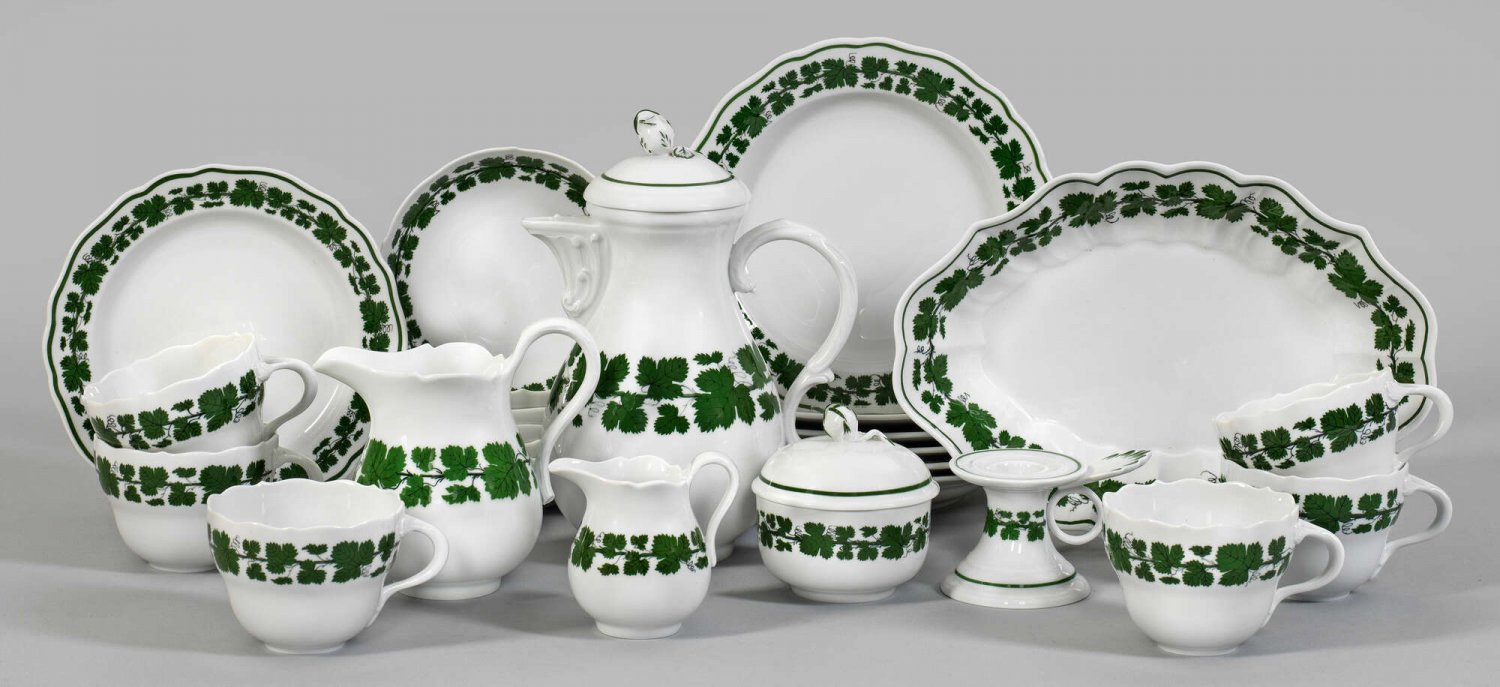 Kaffeeservice mit Dekor "Weinlaub" 19-tlg.; Kaffeekanne, Zuckerdose, 2 Sahnegießer, 6 Tassen mit Untertassen, 6 Kuchen- und ein Konfektteller, Gebäckschale, Kerzenleuchter. Unterglasurgrüner Weinlaubdekor. Minim. best.; Schwertermarke. Kannen-H. 22 cm. Gebäckschale 26,5 cm x 19 cm.