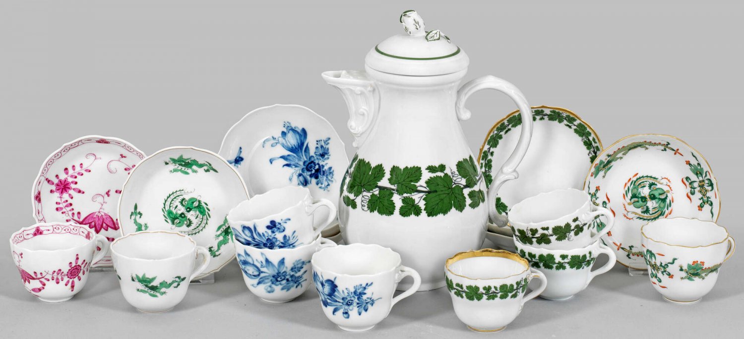 Kaffeekanne und neun Mokkatassen mit Untertassen. Verschiedene Dekore "Weinlaub", "Reicher Drache" und "Blaue Blume" sowie "Indianischer Blumendekor" in unterglasurblauer und -grüner, purpurfarbener Camaieu und polychromer Malerei. Goldstaffage. Untertassen teilw. abweichend. Teilw. minim. best.; Schwertermarke. Kannen-H. 22 cm.