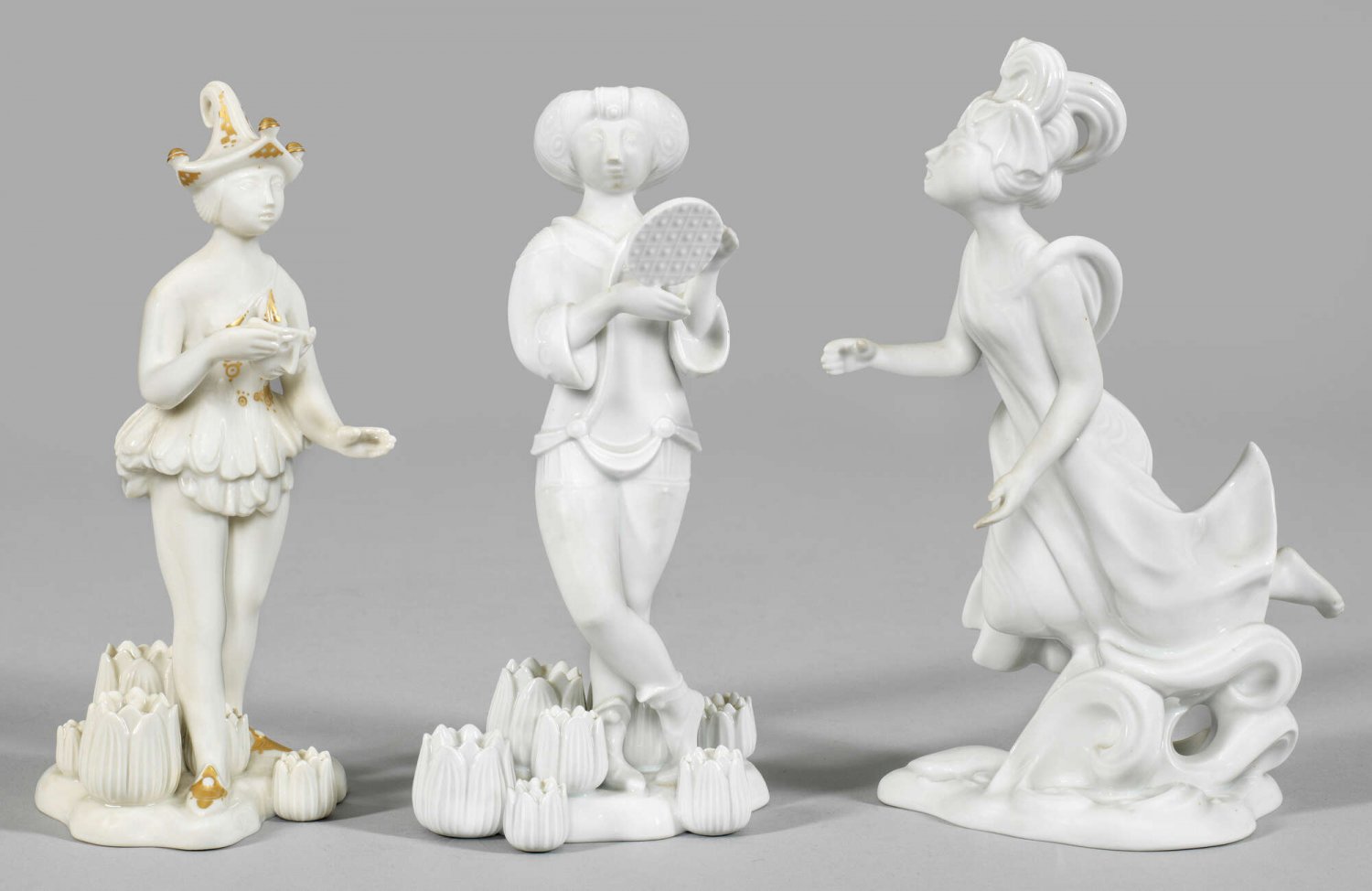 Drei Figuren aus der Serie "Zauberflöte" von Björn Wiinblad Weißporzellan, teilw. mit Golddekor. Auf stilisiertem Sockel mit Wellen bzw. Blumen stehende "Königin der Nacht", stehender "Tamino" und "Papagena". Entw. Björn Wiinblad. Teilw. minim. best.; Manufakturmarke. H. 21,5 cm - 23,5 cm.