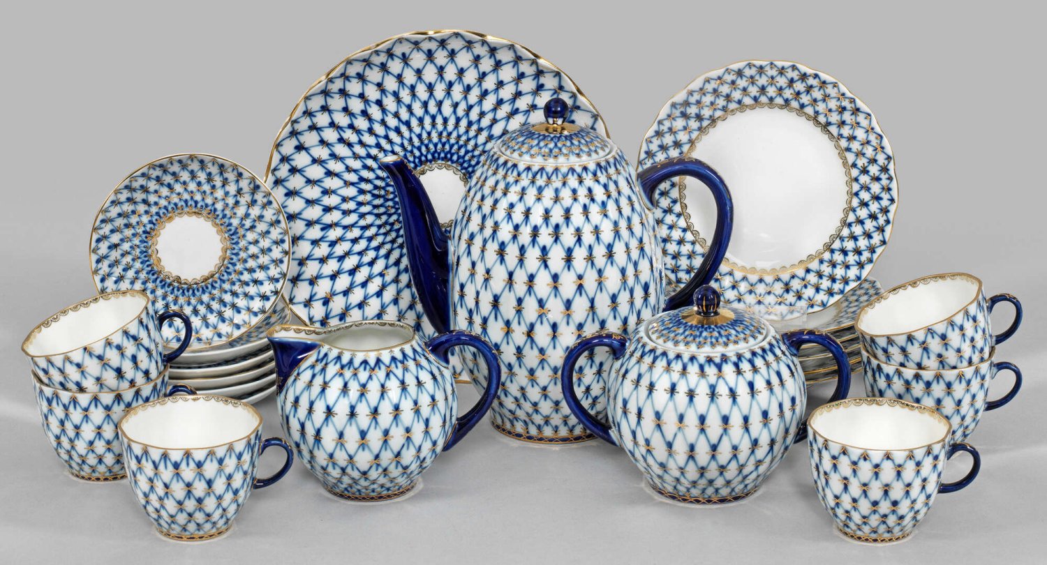 Kaffeeservice mit Dekor "Kobalt-Netz" für 6 Personen. 16-tlg.; Kaffeekanne, Sahnegießer, Zuckerdose, 6 Tassen mit Untertassen, 6 Kuchenteller, Gebäckschale. Form "Tulpe". Flächendeckender Netzdekor in unterglasurblauer, Gold gehöhter Malerei. Dekor-Entw. Anna Jazkewitsch. Goldornamentbordüre. Gestempelte Manufakturmarke. Kannen-H. 19 cm. Schalen-D. 15 cm.