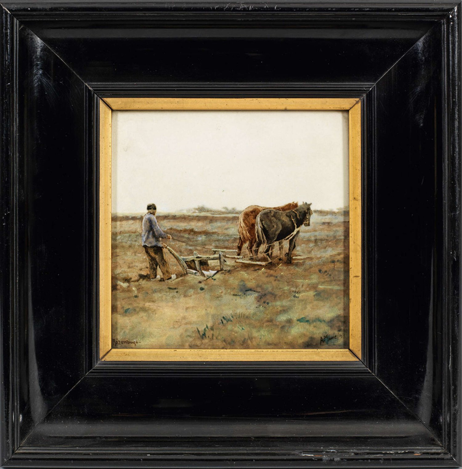 Paar Bildfliesen nach Anton Mauve Feinsteinzeug. Quadratische Bildplatte mit Darstellung eines holländischen Schäfers mit seiner Herde bzw. eines pflügenden Bauern in weiter Landschaft. Sehr feine polychrome Unter- und teilw. Aufglasurmalerei von C. Ch. van Wezenberg nach Gemälden des holländischen Malers Anton Mauve (1838-1888). Bez. "A. Mauve". Rücks. Maler-Monogr.; Manufakturmarke. 15 cm x 15 cm.