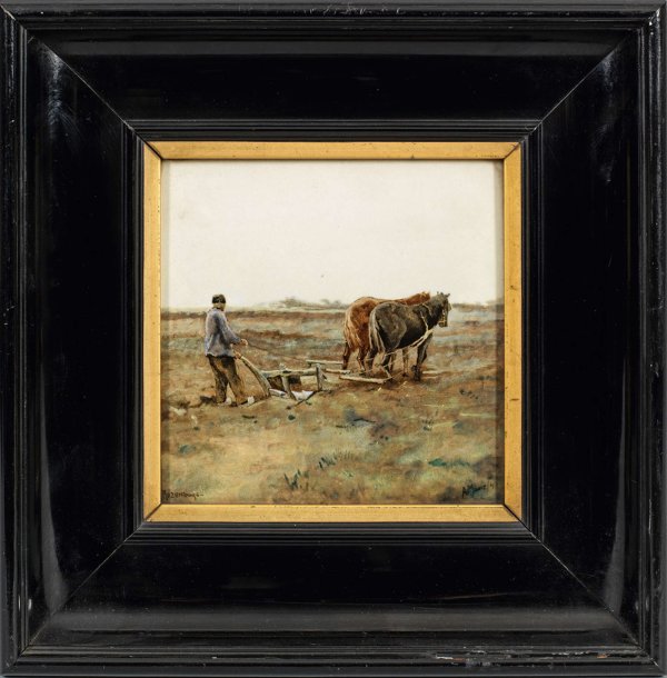 A pair of porcelain placques depicting a Dutch shepherd and a ploughing peasant after A. Mauve. Painter's monogram. Manufacturer's mark.