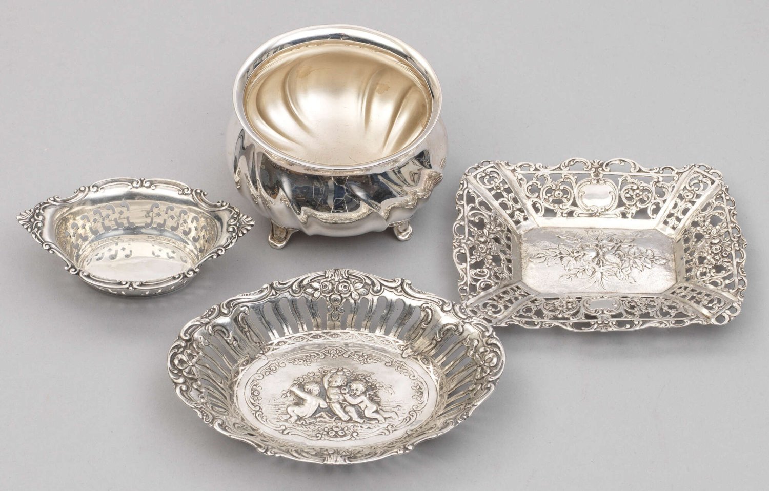Vier Schälchen Silber. Unterschiedliche Formen, teilw. durchbrochen gearbeitet sowie geprägter Reliefdekor. Teilw. gest. 800, 835, Sterling, Herstellerzeichen. Gew. zus. ca. 235 g.