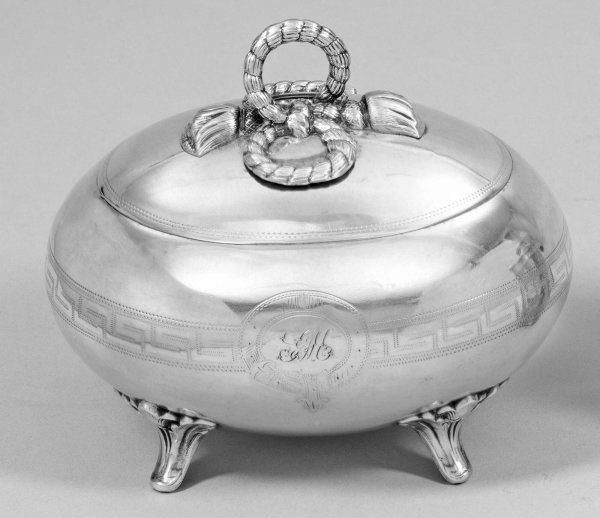 Biedermeier-Zuckerdose Silber. Eiförmiger, mittig von einem graviertem Mäanderband umzogener Korpus, schauseitig Monogrammkartusche. Plastischer Knauf in Form einer Kordel. Innen vergoldet. Unw. besch.; Gest. 750. Gew. ca. 285 g. H. 13,5 cm. 16 cm x 12 cm.