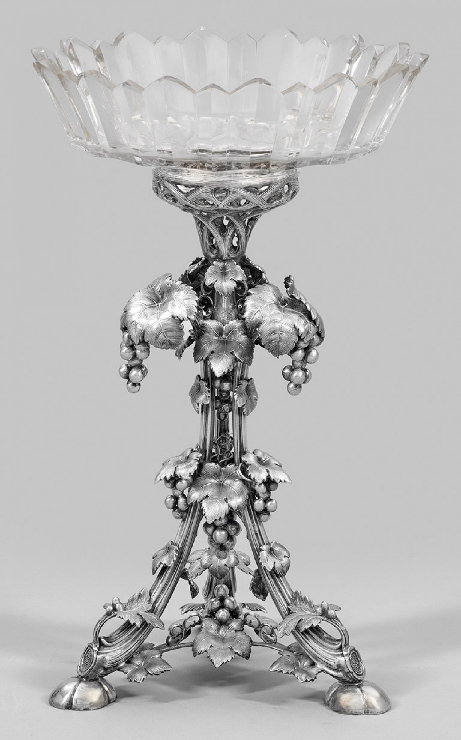 Prächtiger Tafelaufsatz Silber. Aus drei vollplastisch und sehr dekorativ gestalteten Weinreben gearbeiteter, hoher Stand. Herausnehmbare Schale aus Kristallglas mit Walzenschliff, minim. best.; Gest., Stadtmarke, Jahresbuchstabe S5, Herstellerzeichen. Gew. ca. 890 g. H. 44,5 cm.