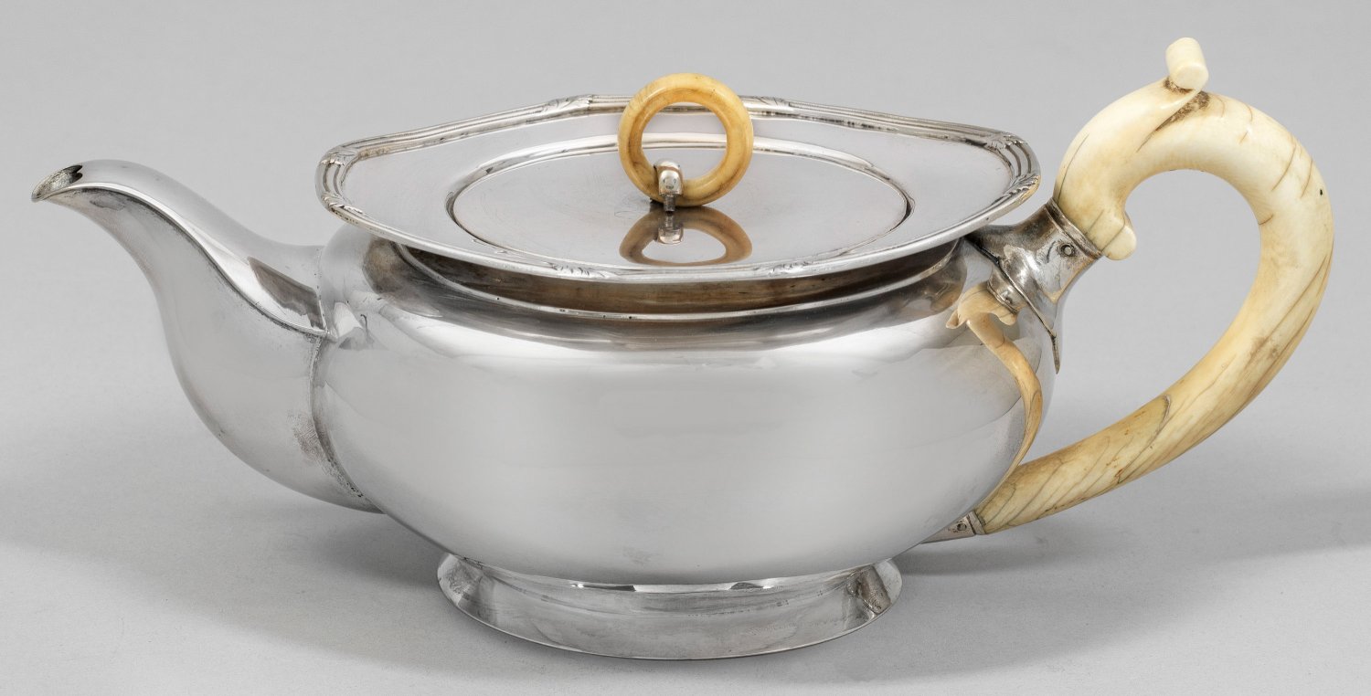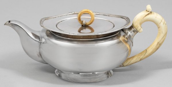 Berliner Teekanne Silber. Stark gedrückt bauchiger Korpus mit glatter Wandung und tief angesetzter Tülle. Ohrenhenkel und Ringknauf aus Elfenbein. Tremolierstrich, Stadt- und Beschaumarke A, Herstellerzeichen. Gew. ca. 580 g. H. 11 cm.