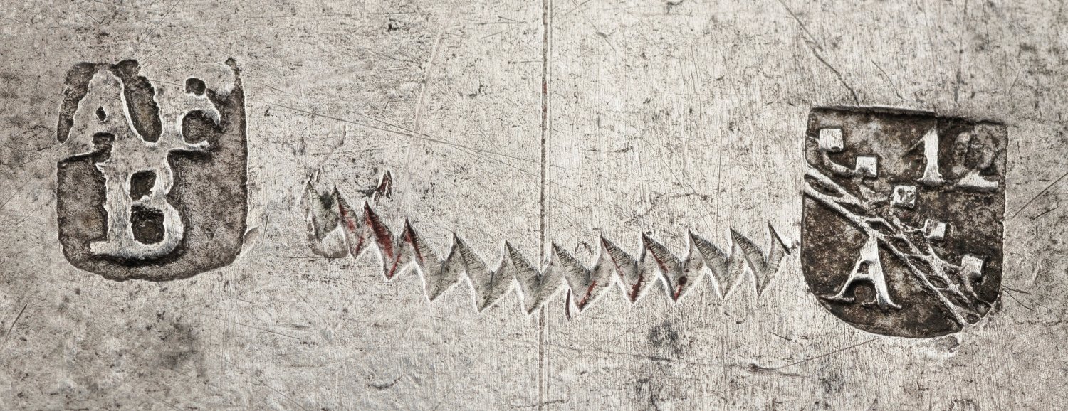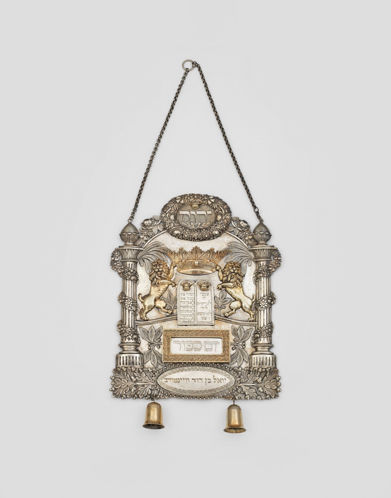 Seltenes museales Toraschild Silber, teilw. vergoldet. Mit getriebenem, graviertem und ziseliertem Dekor. Aschkenasischer Tora-Schmuck, zur Zierde der eingerollten Tora-Rolle. Von zwei korinthischen Säulen flankiertes Schild mit Kette, das an das Brustschild des Hohenpriesters Aaron erinnert. Die Tora wird im sog. Toramantel eingewickelt und mit dem Toraschild verziert. Die Säulen, an denen sich Blütenranken emporranken, stehen sinnbildlich für die beiden Säulen Jachin und Boas des Salomonischen Tempels, der sich auf dem Tempelberg in Jerusalem befand. Bekrönt von Tetragrammaton mit Gottes Name Jahweh, in üblicher, unvokalisierter Form "JHWH", zur Abwehr des Bösen. Geschmückt mit Blumenkranz. Unter großer, zentral applizierter Torakrone, zwei steigende, vergoldete Löwen, die Gesetzestafeln mit den zehn Geboten haltend. Darunter eine von Voluten gerahmte Kartusche mit hebräisch bez. und gravierten Schriftplättchen, die den jeweiligen Feiertag des jüdischen Jahres anzeigen, an dem aus der Tora gelesen wird. Scharnierter Kartuschendeckel zum Aufklappen ermöglicht Austausch der Schriftplättchen. In der Kartusche vier beidseitig gravierte und bez. Silberplättchen mit den Feiertagen Rosh Hashana (jüdisches Neujahrsfest), Shabat Rosh Chodesh, Shabat, Sukkot (Laubhüttenfest), Jom Kippur (höchster jüdischer Feiertag), Pessach (jüdisches Osterfest), Shawuoth (jüdisches Erntedankfest) und Shmini Azeret bzw. Simchat Torah. Mit dekorativem Palmetten-, Akanthusblatt- und Eichenlaubdekor. Reserve mit Namen des Stifters in hebräischer Schrift "Joel Ben David Weintroib". An der Unterkante des Schildes zwei Glocken. Gest., Tremolierstrich, Stadtmarke, Meistermarke Anton Friedrich Burgmüller (wird Meister 1797). Drei Glocken fehlen. Gew. ca. 730 g. 28,5 cm x 23 cm.