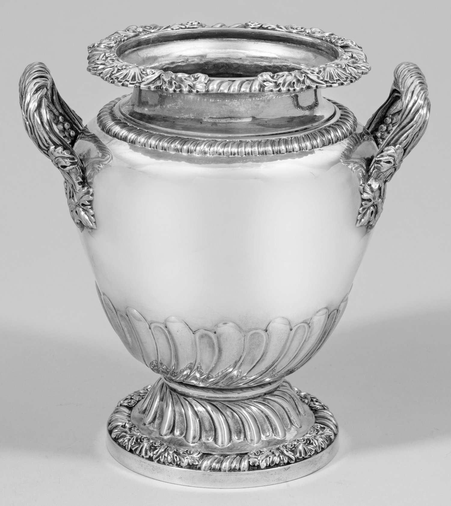 Odiot-Champagnerkühler Über gewölbtem Stand sich konisch erweiternder Korpus mit gerundeter Schulter und weit ausschwingendem Rand. Auf dem Stand, dem Wandungsansatz und am Rand stark reliefplastischer Dekor aus breitem Zungenfries, stilisierten Blättern und Muscheln. Hochgezogene Griffe in Form von Weinreben. Gebrauchsspuren. Gest., Beschaumarke, Herstellerzeichen. Gew. ca. 2500 g. H. 26 cm.
