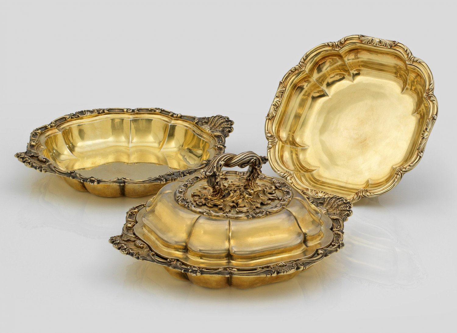 Silber, vergoldet. Vierpassig geschweifter Korpus, mit erhabenem reliefplastischem Dekor aus Akanthusblättern, Blüten, Rocaillen und Muschelwerk. Korrespondierender Deckel mit abnehmbarem Griff als Schale verwendbar. Beschaumarken, Ältermannbuchstabe, Herstellerzeichen. Gew. zus. ca. 4119 g. H. 5 cm - 13,5 cm, 28 cm x 32 cm.