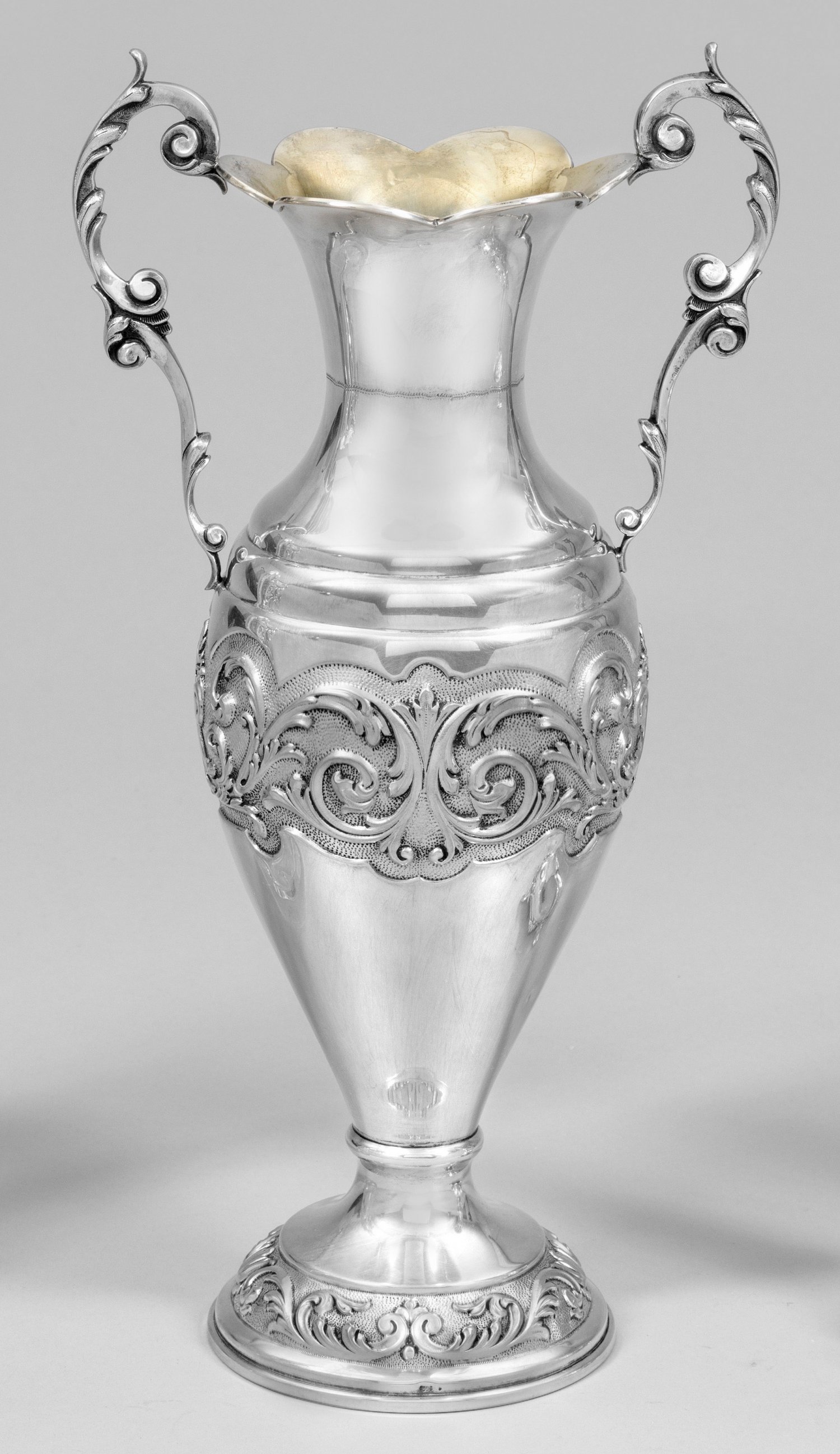 Hohe Vase Silber. Ovoider Korpus mit weit ausschwingendem, blütenförmig geschweiftem Hals und Volutenhenkeln. Wandung und Stand umzogen von Akanthusrankenrelief. Innen vergoldet. Gest. 835, Beschauzeichen, undeutl. Herstellerzeichen. Gew. ca. 700 g. H. 39 cm.