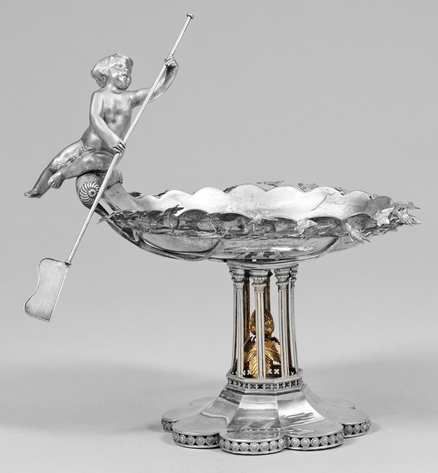 Seltener Augsburger Tafelaufsatz Silber. Über achtpassigem mit durchbrochenem floralem Fries umzogenem Stand eine vollplastisch gearbeitete Erdbeere. Offen gearbeiteter Schaft aus acht kannelierten, schlanken Säulen. Leicht gemuldeter Spiegel, wellenförmiger Rand mit plastischen Efeuranken umzogen. Am Rand eine sitzende Putte mit Steuerruder in den Händen. Stadtmarke, Meistermarke Friedrich Ernst Dassdorf (wird Meister 1804), Juweliermarke Johann Alois Seetaler (wird Meister 1796). Gew. ca. 700 g. H. 16 cm - 27,5 cm.