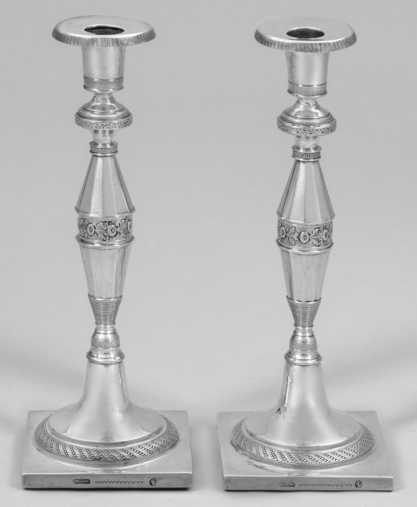 Paar Berliner Tafelleuchter Silber, Stand beschwert. Über quadratischer Plinthe zwölfseitiger Balusterschaft mittig mit plastischem Akanthusfries umzogen. Vasenförmige Tülle mit herausnehmbaren Traufschalen. Fuß mit Punktgravur B.v.K. Tremolierstrich, Stadtmarke (H. W. Zarnack 1817 - 1819), Meister Johann Heinrich Fromm (wird Meister 1812). Gew. zus. ca. 1012 g. H. 23,2 g.