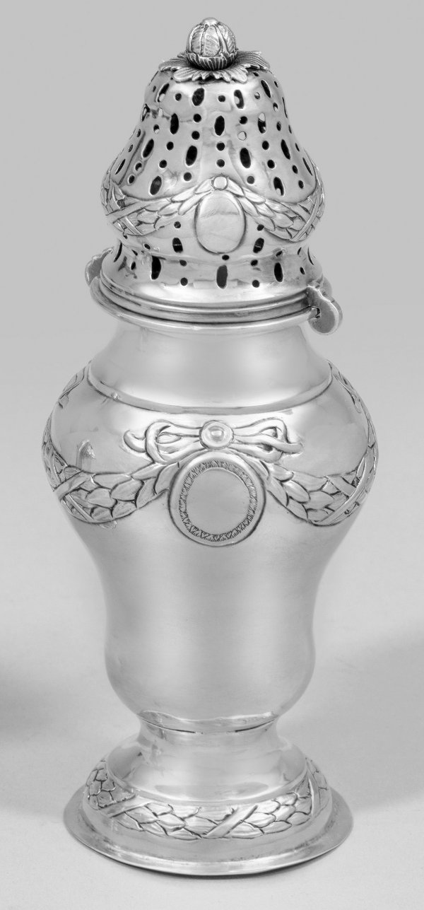 Louis XVI-Zuckerstreuer Silber. Runder, aufgewölbter Fuß, balusterförmiger Korpus mit plastischer Frucht als Knauf. Umlaufend von Schleifen gehaltene Medaillons durch festonierte Blattranken miteinander verbunden. Stadtmarke, Meister Johann Georg Hederich (wird Meister 1730). Gew. ca. 195 g. H. 18,5 cm.
