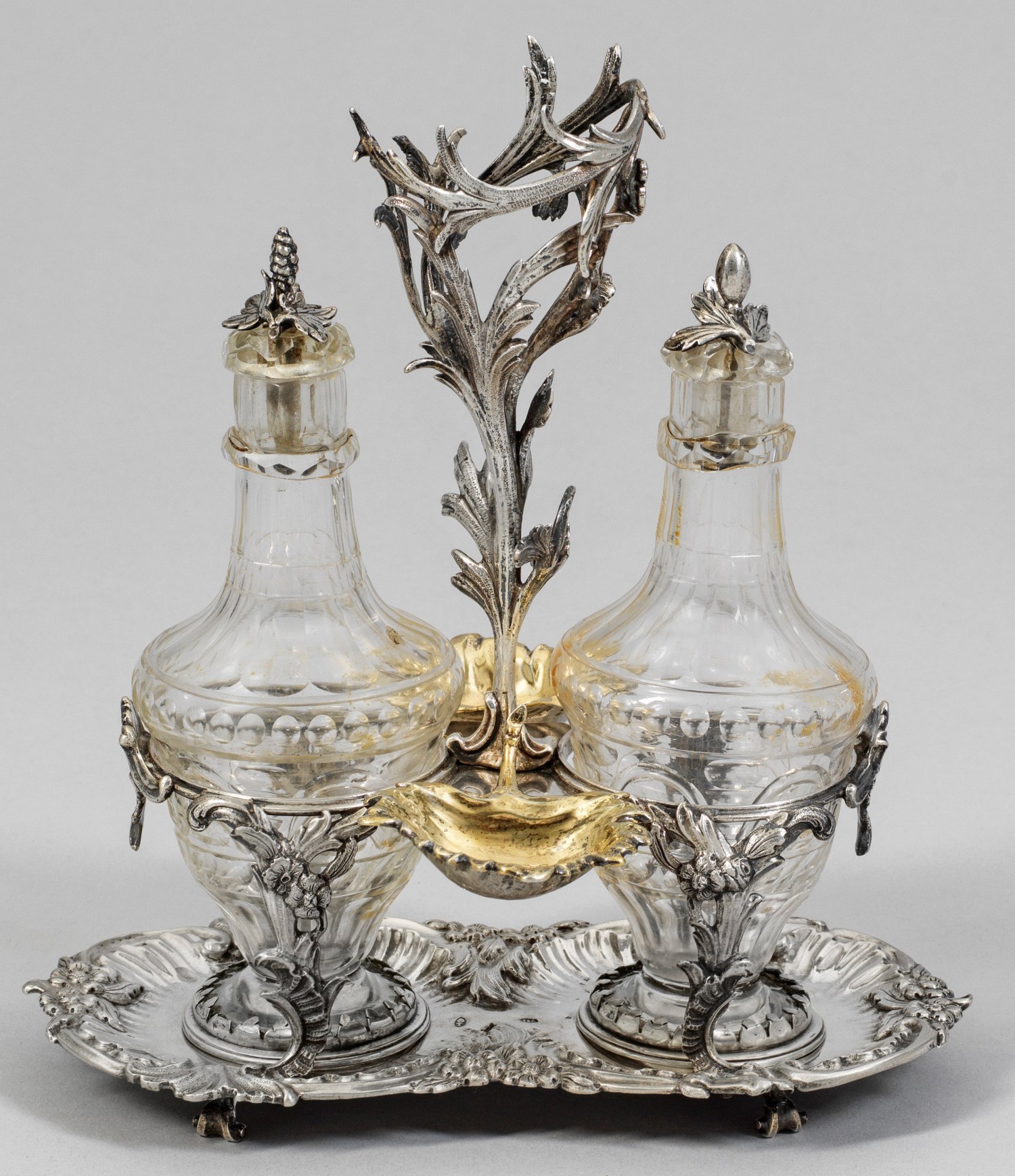 Prächtige barocke Menage Silber. Auf ovalem, zur Mitte kurz eingezogenem Untersatz mit Blatt- und Blütenrelief montiertes Gestell für zwei Ölfläschchen, die Fassungen von floralen Stützen getragen. Seitlich blattförmige, vergoldete Salzschälchen montiert. Als Handhabe ein filigraner, naturalistischer Blattzweig. Flaschen aus geschliffenem, farblosem Glas mit Silbermontierung. Gest. Tremolierstrich, Stadtmarke, Meister Johann Jakob Adam (wird Meister 1748). Gew. ca, 500 g. (ohne Flaschen). H. 23 cm.