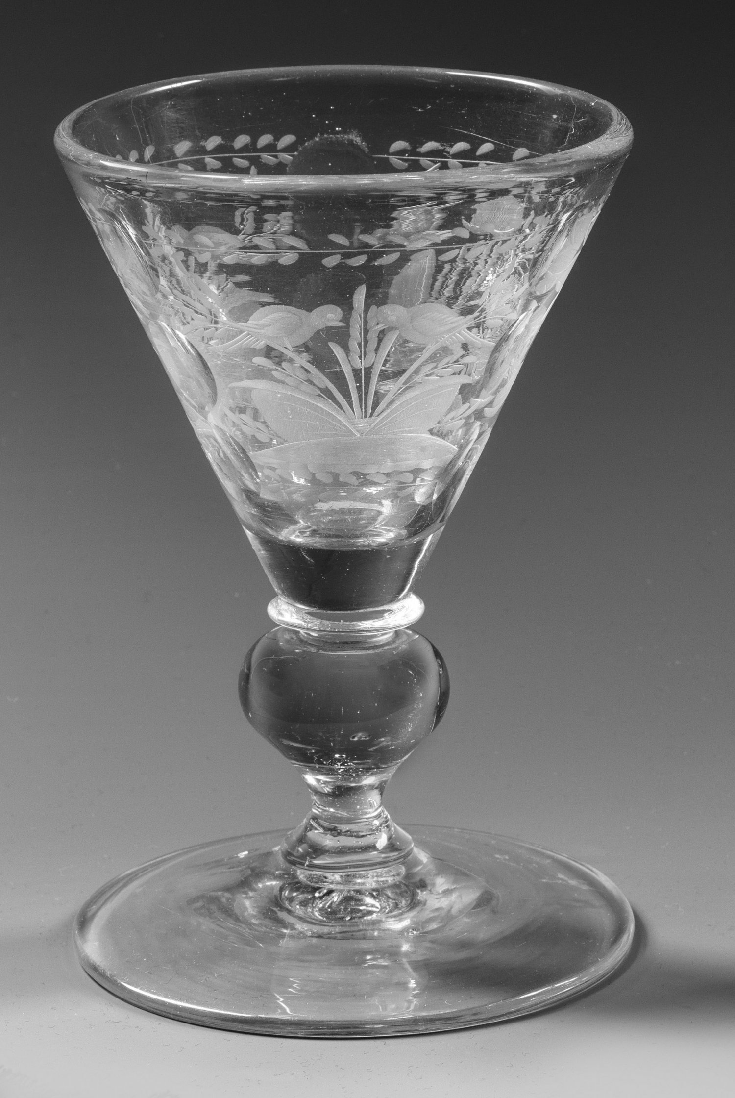 Böhmischer Barock-Trichterpokal Farbloses Glas. Mittig ansteigender Scheibenfuß, massiver Balusterschaft, konische Kuppa. Geschnittener Dekor aus Vogelpaaren bzw. Blumenbukett mit Vogel, gegliedert durch vertikale Bänder aus jeweils drei Schliffkugeln. H. 17,8 cm.