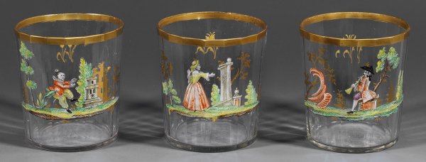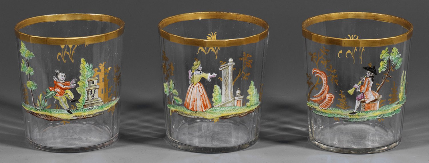 Drei Rokoko-Becher Farbloses Glas. Facettierte Wandung. Dekor in polychromer Emailmalerei und Gold aus Parklandschaften mit musizierendem Herrn, junger Dame und tanzender männlicher Figur, wohl aus der Italienischen Komödie. Rücks. jeweils ein Tulpenmotiv. H. 8 cm.