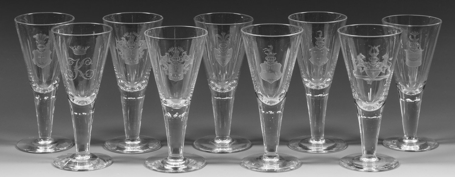 Satz von neun Spitzkelchpokalen mit Adelswappen Farbloses Glas. Im massiven Schaft jeweils neun kleine eingestochene Luftblasen. Auf der Kuppa in sehr feinem, teilw. geblänktem Mattschnitt unterschiedliche Wappen von acht verschiedenen Adelsfamilien bzw. Persönlichkeiten, auf der Fußunterseite jeweils namentlich bez., zwei dat. 1890: von Bothmer, von Callmeyer, von Dassel, Kuschel (bekröntes Monogr. "K"), von Mannerfelt, von Rosenberg, Joachim von Tresckow und Karl von Zychlinski. Drei Pokale am Lippenrand minim. best. am Lippenrand. H. 16,2 cm.