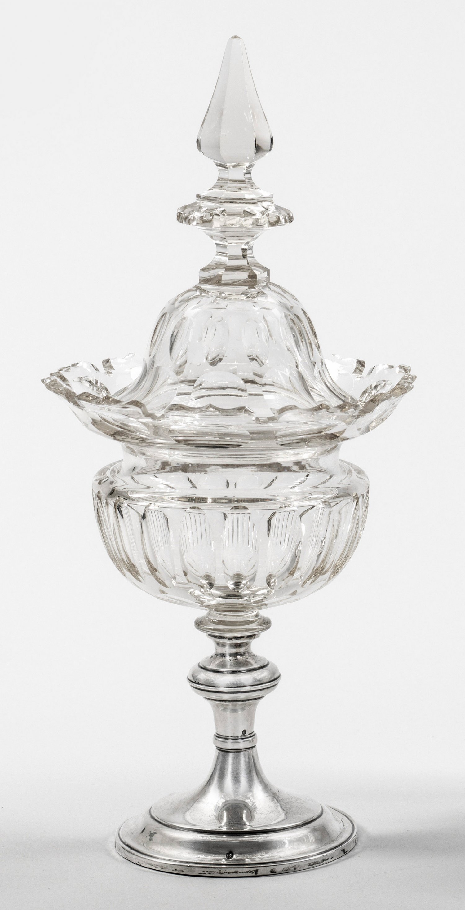 Glas-Bonbonniere mit Delfter Silbermontierung Farbloses Glas, geschliffen. Glockenförmiger Korpus mit fassoniertem Rand. Korrespondierender, hoher Deckel. Fuß und Schaft aus Silber, gem.; Niederländische Feingehaltsmarke für 833er Silber; Delfter Beschau-/Stadtmarke. H. 42 cm.