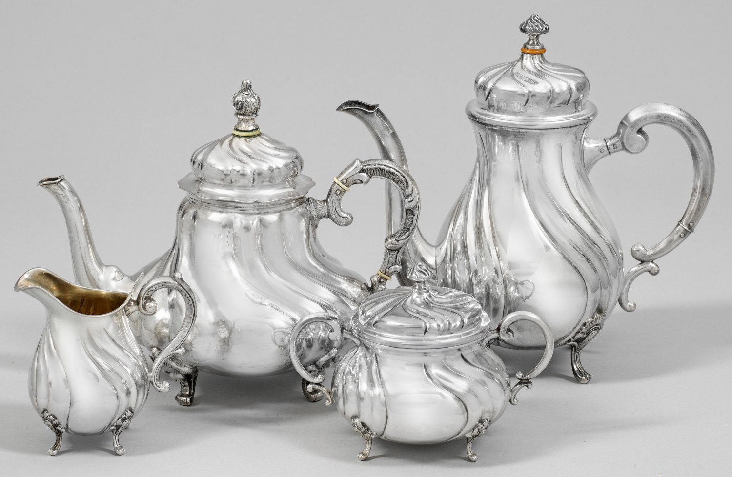 Kaffee- und Teeservice Silber. 4-tlg.; Tee- und Kaffeekanne, Sahnegießer und Zuckerschale. Birnförmiger von geschweiften Zügen gegliederter Korpus über geschweiften Beinen im Stil des sog. Dresdener Hofmusters. Teekanne mit abweichendem Dekor. Gest. 800, Herstellerzeichen. Gew. zus. ca. 2052 g. H. 11 cm - 25 cm.