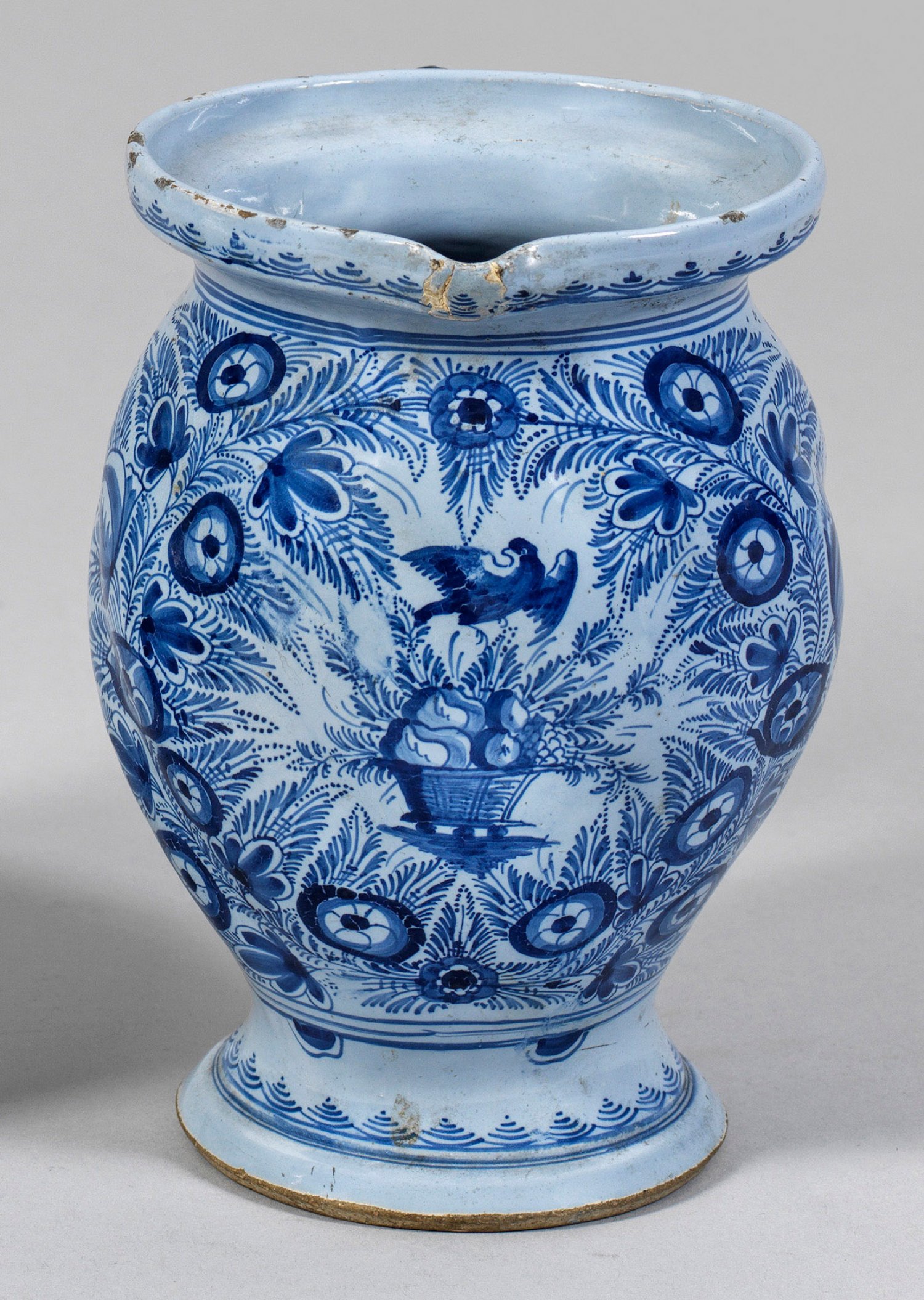 A Nuremberg light blue glazed faience milk jug with blue painted decoration of fruit basket with bird, flower branches and bouquets of flowers. Minor chips.
