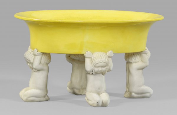 Tafelaufsatz von Michael Powolny Keramik, weiß und gelb glasiert. Ovaler Tafelaufsatz, getragen von vier knienden Putti. Modell-Nr. 293. Entw. Michael Powolny, um 1910. Marken der Wiener Keramik und Gmundner Keramik. H. 18 cm. 32 cm x 20 cm.