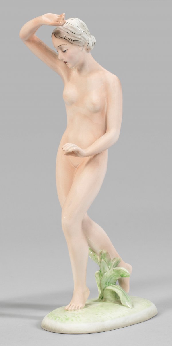 Seltene Figur einer jungen ungarischen Tänzerin in Tracht Steingut. Auf ovalem, schwarzem Sockel in Tanzhaltung posierende Tänzerin. Polychrome Bemalung bzw. Staffierung. Entw. um 1936. Modell-Nr. 7558. Rest.; Manufakturmarke mit Bez. "MADE IN AUSTRIA" und Maler-Sign.; H. 24,7 cm.