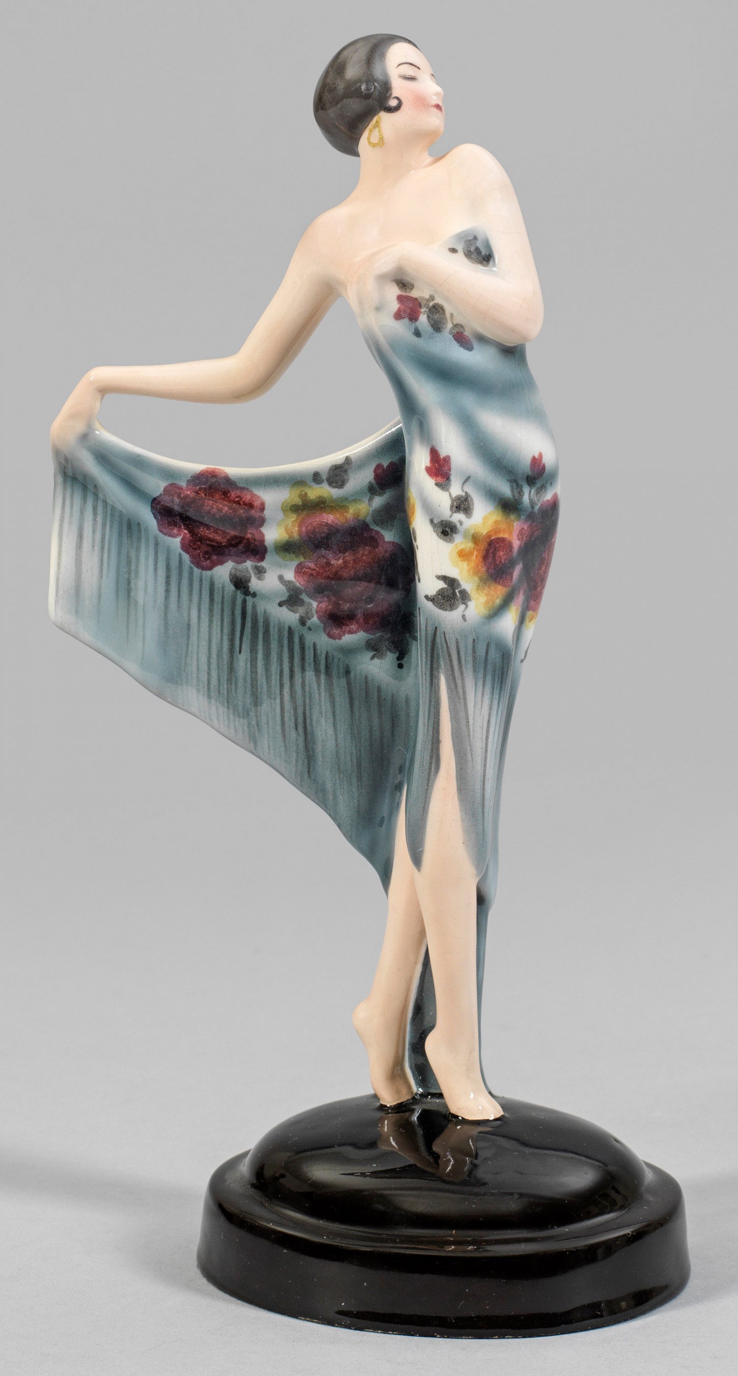 Seltene Goldscheider-Aktfigur Steingut. Auf hellgrünem, stilisiertem, ovalem Natursockel schreitender, weiblicher Akt mit erhobenem rechten Arm. Polychrome Bemalung bzw. Staffierung. Modell-Nr. 8745. Manufakturmarke mit Bez. "MADE IN GERMANY" und Maler-Monogr.; H. 36 cm.