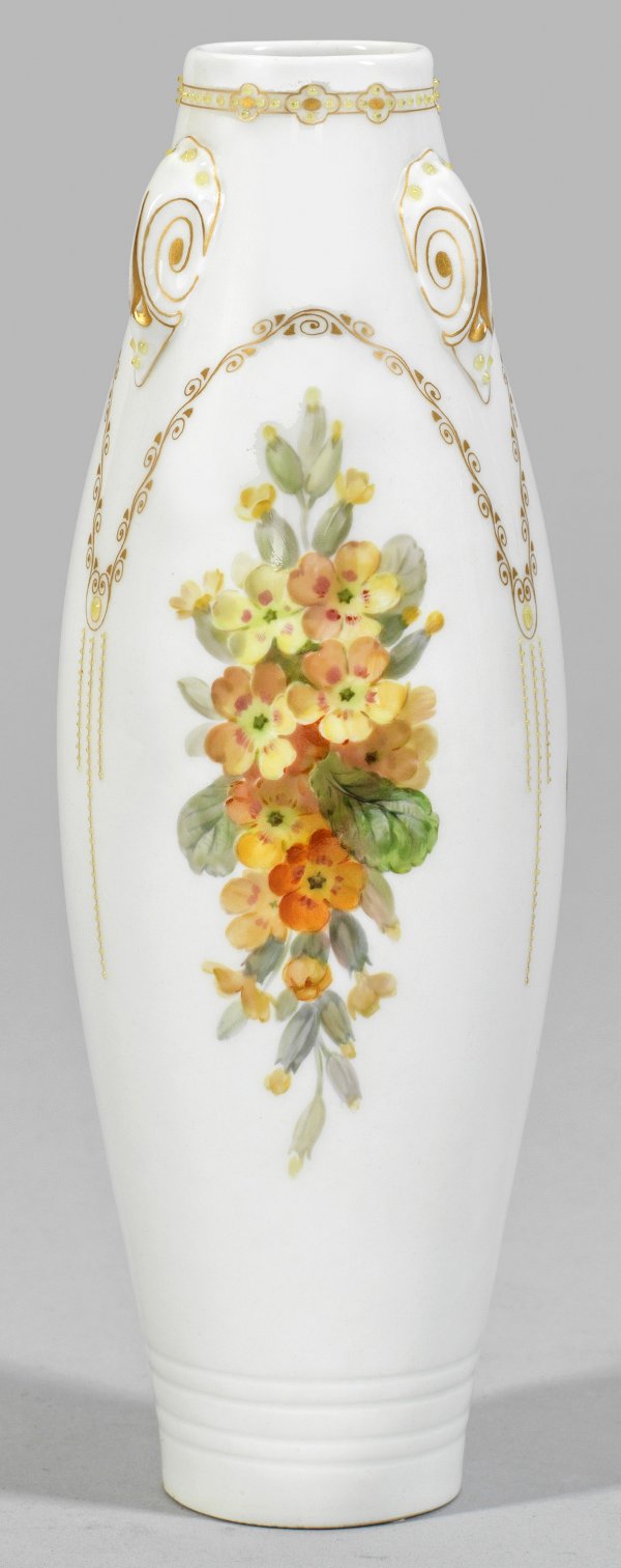 Kleine Jugendstil-Vase Spindelförmiger Korpus, oberhalb von drei tropfenförmig aufgelegten Buckeln, unterhalb von vier waagerechten Rillen gegliedert. Auf der Wandung symmetrisch angeordneter, bogenförmiger Rankendekor als Rahmung für feine Blumenarrangements. Mündungsrand mit stilisierter Blütenbordüre. Polychrome, weiche Blumenmalerei mit zitronengelben Emailperlen. Form-Entw. Theo Schmuz-Baudiss. Dekor-Entw. wohl Heinrich Lang. Zepter- und Malereimarke. H. 22,5 cm.
