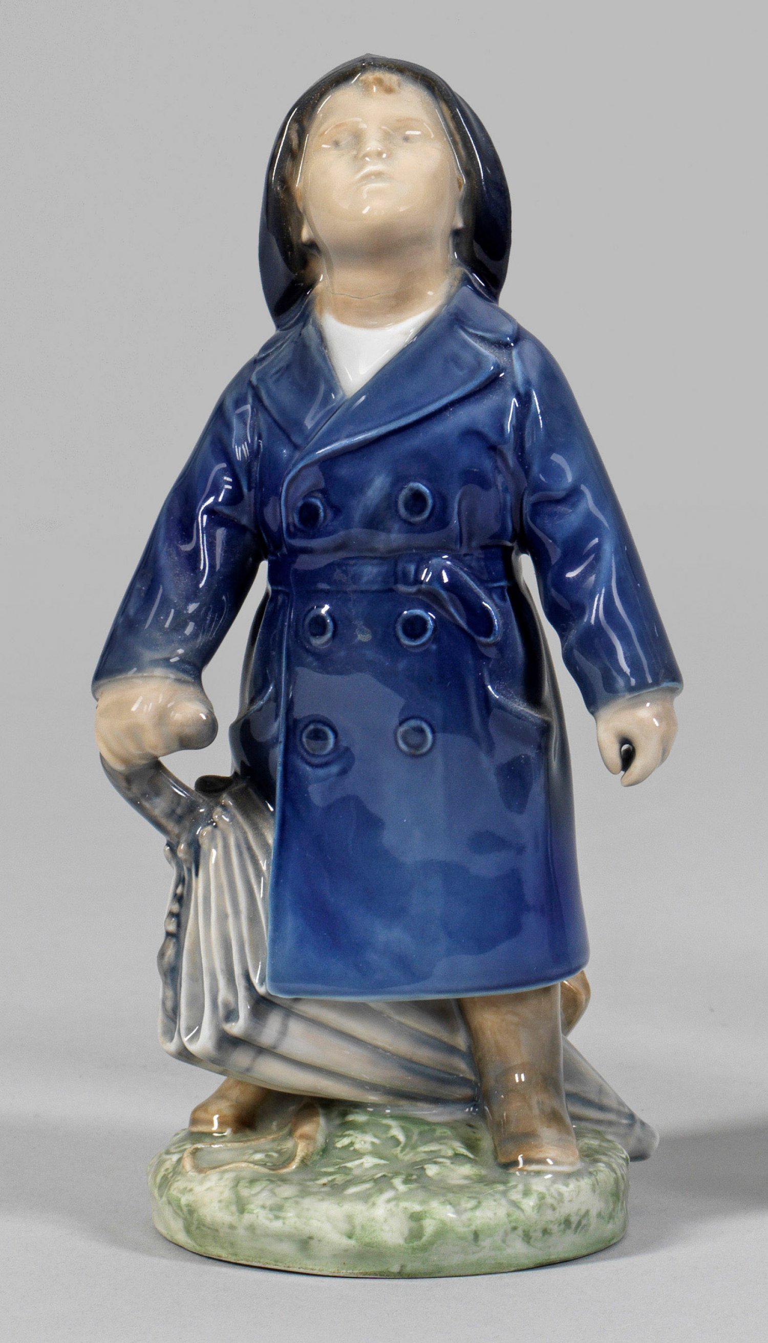 Junge mit Regenschirm zum Himmel aufschauend. Polychrome Unterglasurmalerei. Entw. Adda Bonfils. Entw.-Monogr.