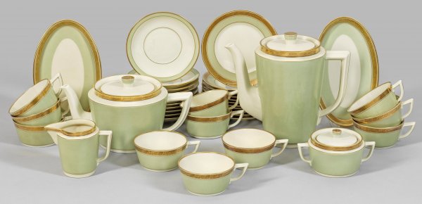 Kaffee-bzw.Teeservice mit lindgrünem Fond für 11 Personen. Elfenbeinfarbenes Porzellan. 28-tlg.; Kaffee-, Teekanne, Zuckerdose, Sahnegießer, 11 Tassen mit Untertassen. 11 Desserteller, 2 kleine Tabletts. Teilw. lindgrüner Fond. Umlaufende Golddekorbordüre. Manufakturmarke. Kannen-H. 14 cm - 22 cm.