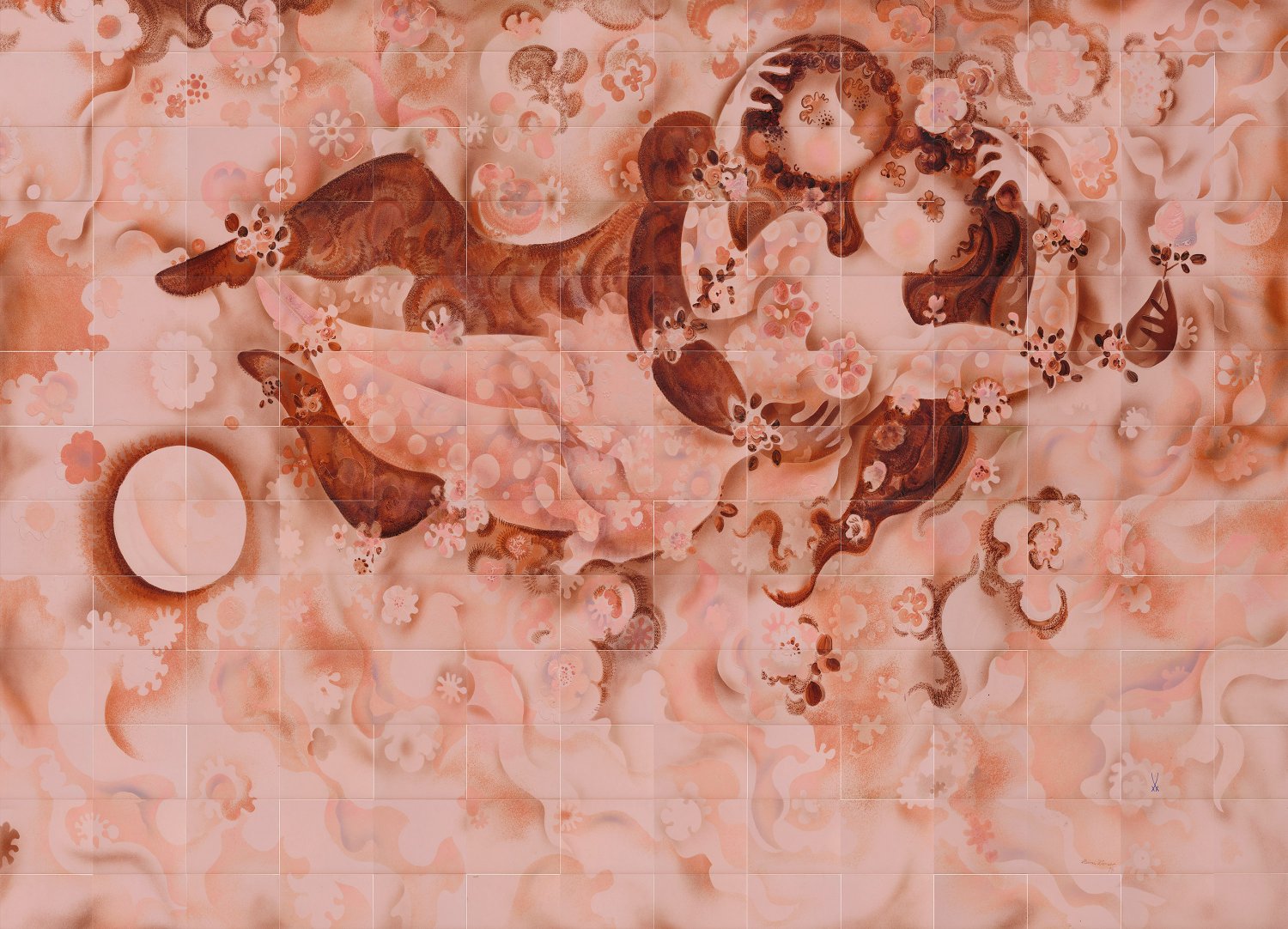 Unikat. Großformatiges, aus insgesamt 182 rechteckigen Porzellanplatten zusammenfügtes Wandbild. Auf glatter, teilw. reliefierter Oberfläche anmutende, amouröse Darstellung eines zwischen Wolken und Blumen schwebenden, sich innig umarmenden Paares im Mondschein bei Nacht. In erdigen Braun-, rostroten bis rosèfarbenen Tönen ausgeführte Malerei in Unter- und Aufglasur, teilw. in Schablonenspritztechnik sowie Pâte-sur-Pâte. Entw. und Ausführung Prof. Heinz Werner. R. u. Künstler-Sign. mit Dat. "H. Werner (19)77". Schwertermarke. 266 cm x 418 cm.